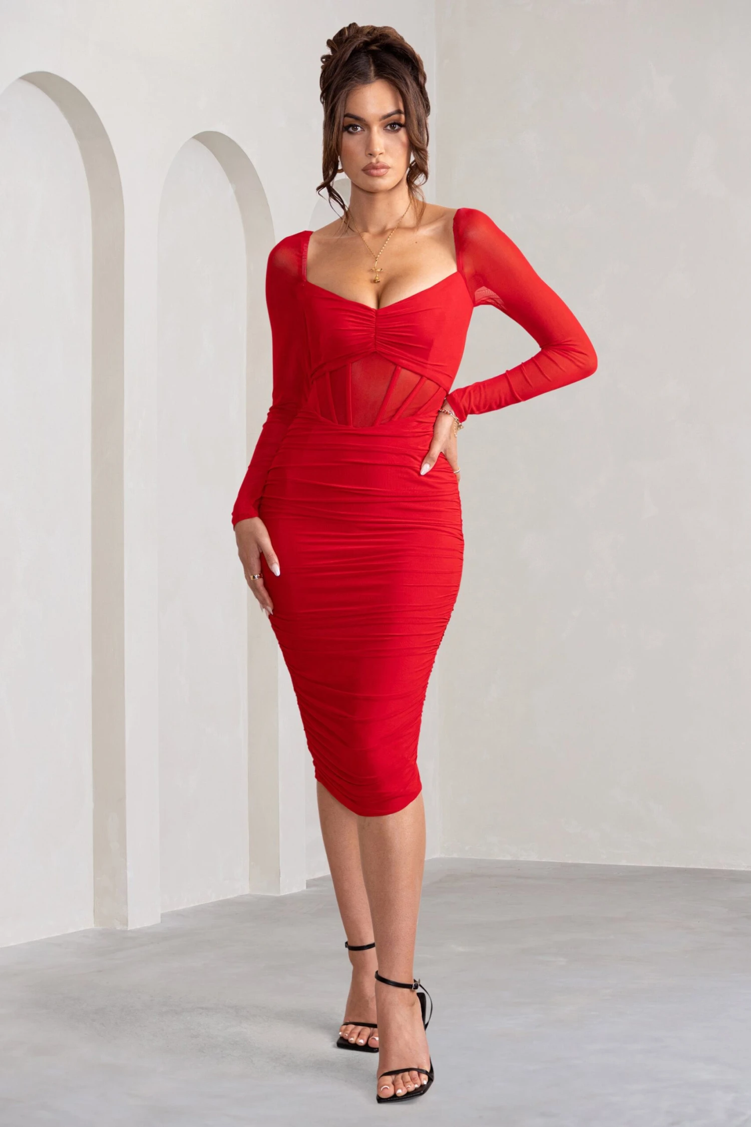 Be the first to review “Abiba | Red Ruched Front Corset Midi Dress With Long Sleeves” Cancel reply