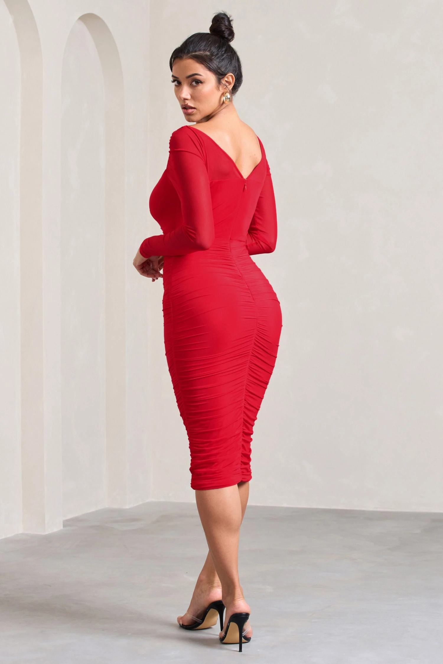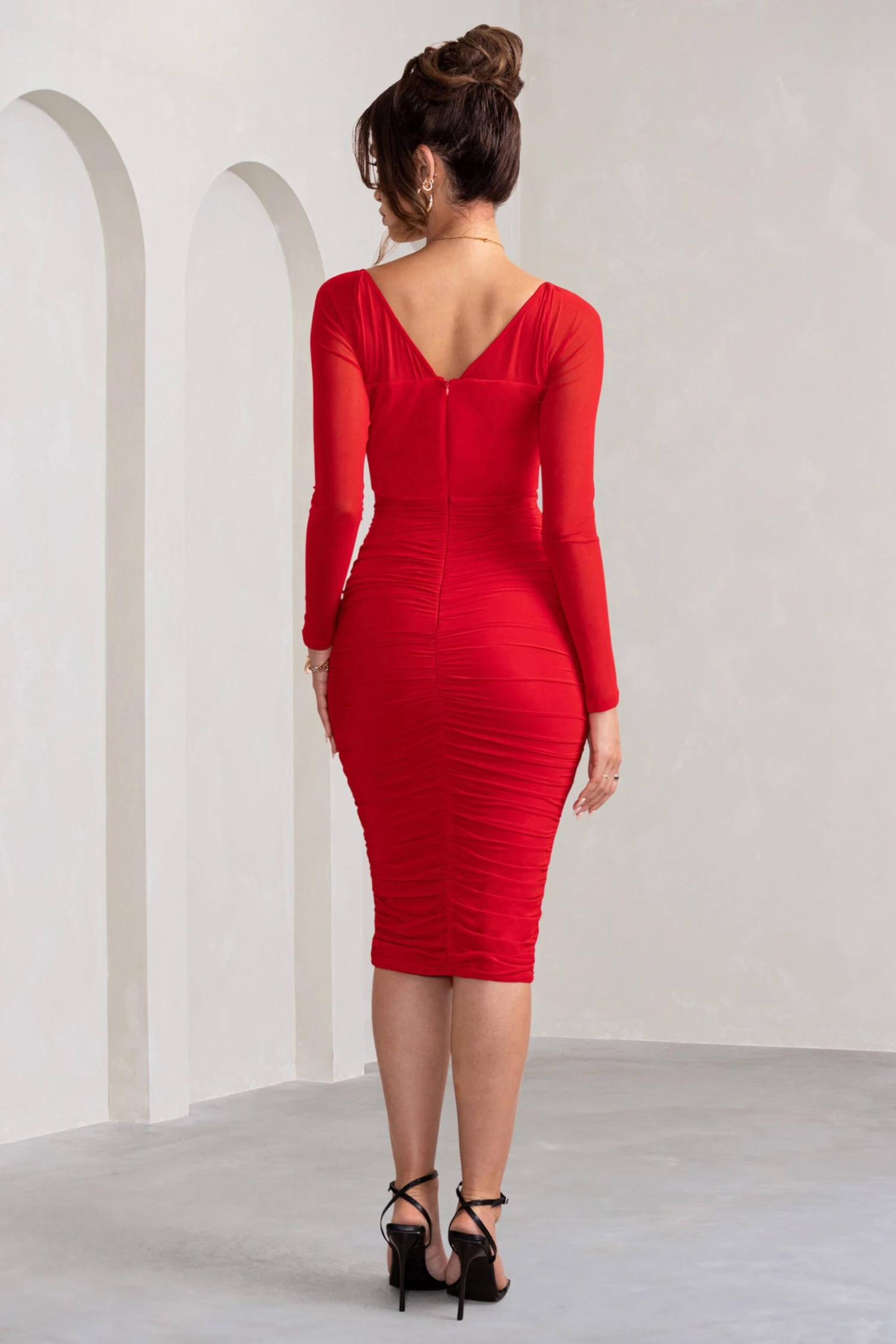 Super stylish and flattering, our Abiba midi dress has been designed to stand out. Featuring a flattering ruched front detail with a sculpting corset bodice and curve-contouring skirt creating the perfect hourglass figure. Crafted with our premium jersey fabric in a passionate red shade, this unforgettable design will turn heads at your next black-tie event, glam night out or special occasion coming up. Want to add some glow? Style this exquisite look with our dazzling Alessia diamante teardrop tassel earrings, all eyes will be on you!