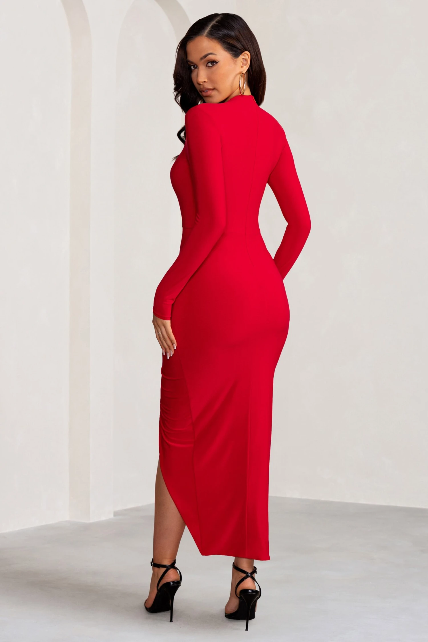 This scarlet showstopper is our Alana maxi dress crafted in Club L’s signature stretch jersey. Dramatic yet demure, the red maxi dress features a high neckline, fitted sleeves and a long wrap skirt with artful ruching. Pair this bodycon dress with strappy black stilettos for an unforgettable evening outfit.