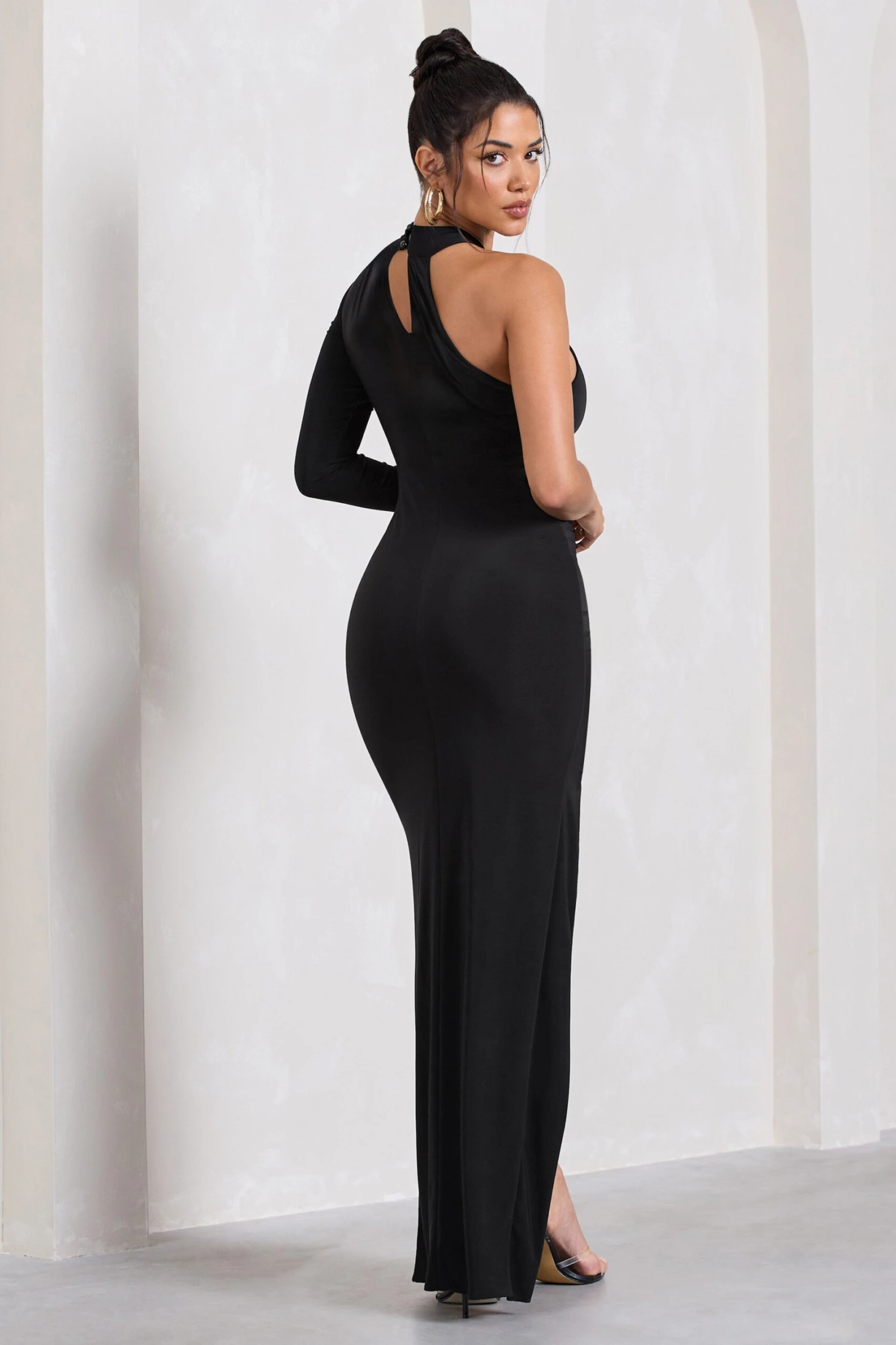 Sophisticated in both shade and silhouette, Alina is a classic choice for your next romantic date night or race day event. This black maxi dress features a high neckline that falls into a contemporary one-sleeve design, before finishing with ruching to carefully cinch your waist.Â