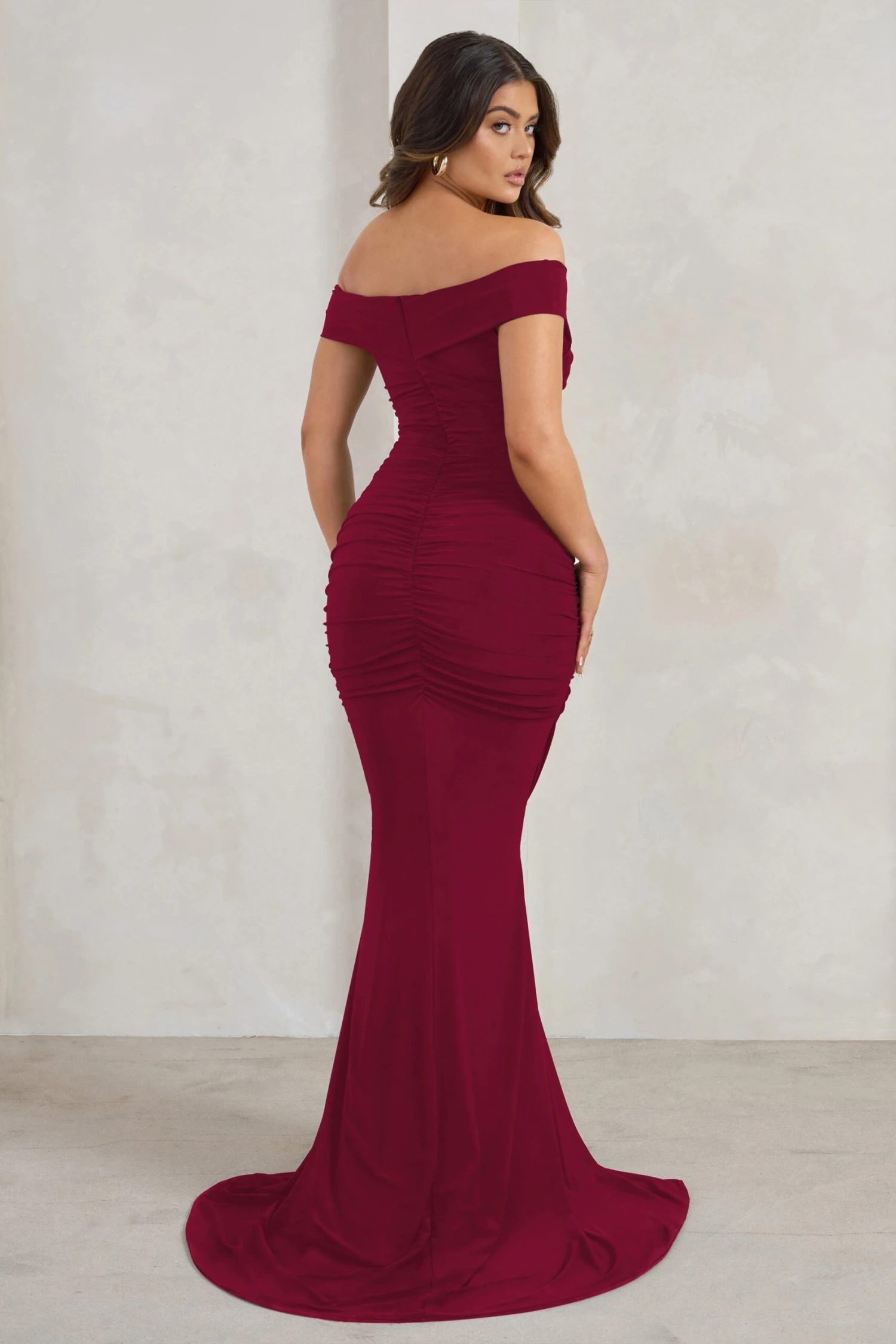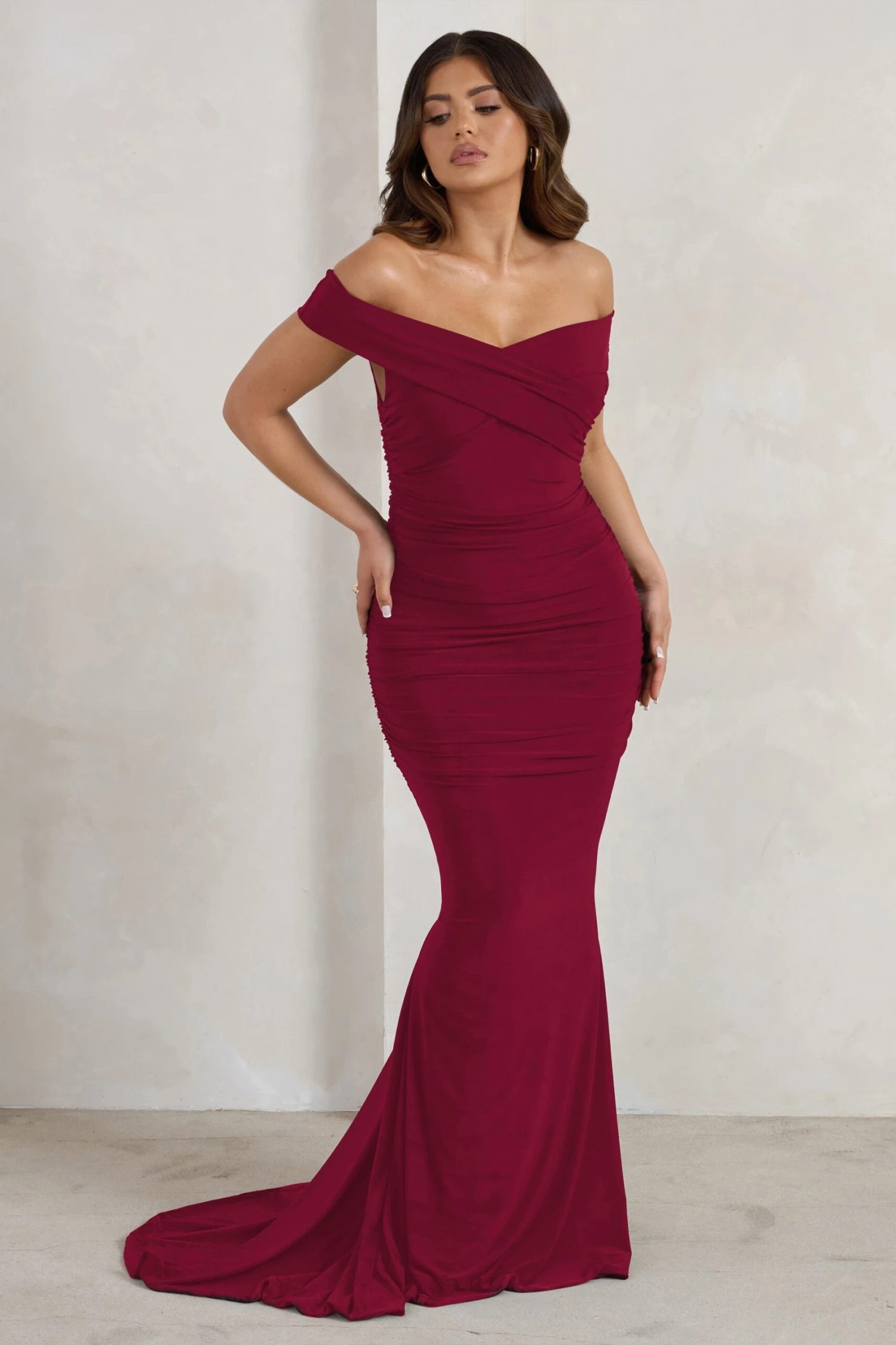 Be the first to review “Apolline | Berry Off The Shoulder Ruched Fishtail Maxi Dress” Cancel reply