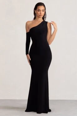 Step out in style in Baylor, our black maxi dress. Featuring a cascading hemline and an asymmetric one-shoulder with a cut-out long sleeve, Baylor is a showstopping piece to add to your event wardrobe. The feminine silhouette will contour your curves so that you can step out in confidence. Expertly crafted in our luxe jersey material, this glamorous dress is perfect for any black-tie event or occasion. Turn heads in effortlessly chic styles with Club L.