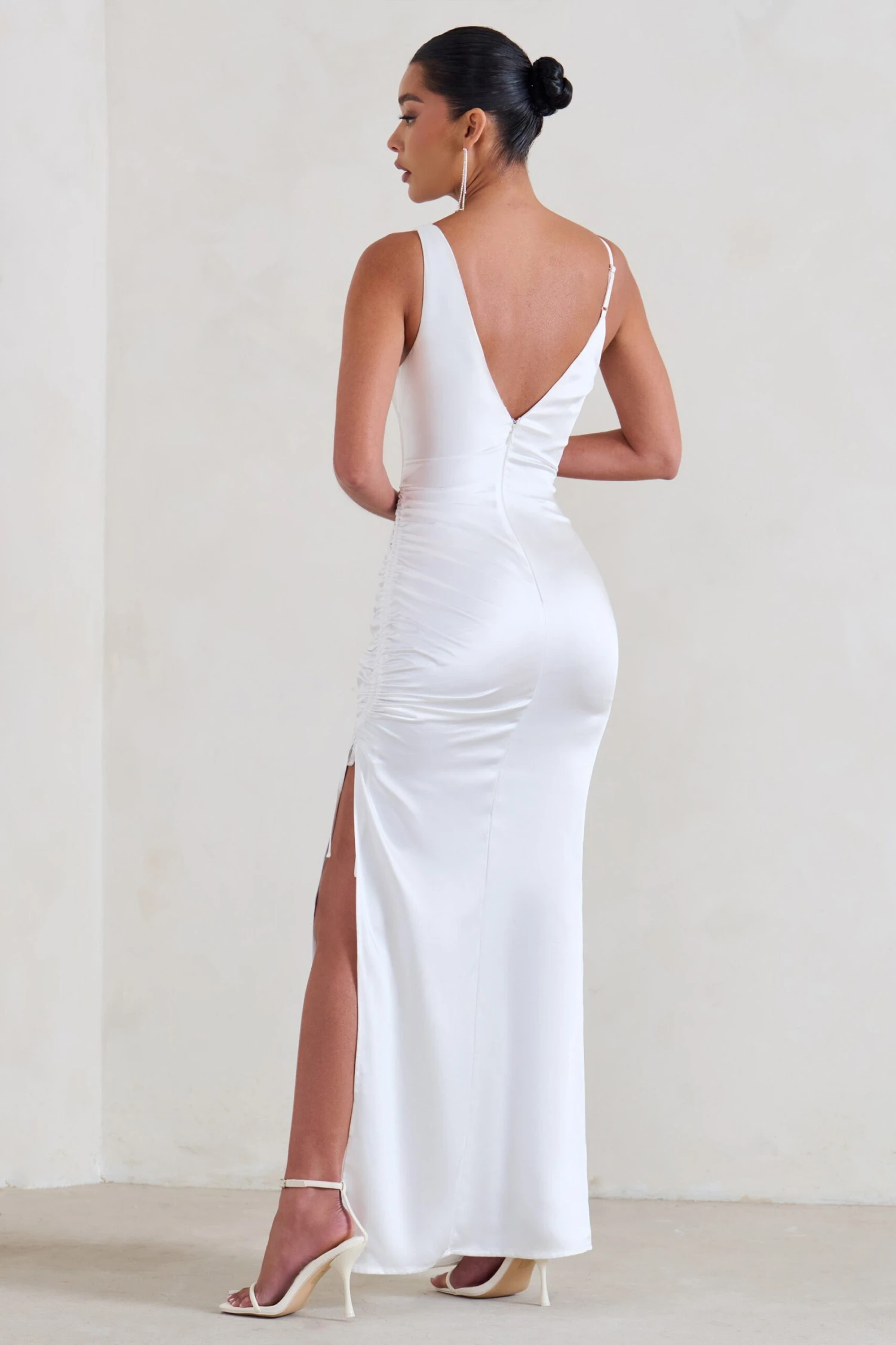 Our latest satin slip dress Belonging certainly belongs in your wardrobe this season, boasting an asymmetric silhouette with a draped cowl neckline and one single cami strap. Accentuating your curves with delicate side ruching, this white maxi dress would suit any special occasion from date nights to destination weddings.