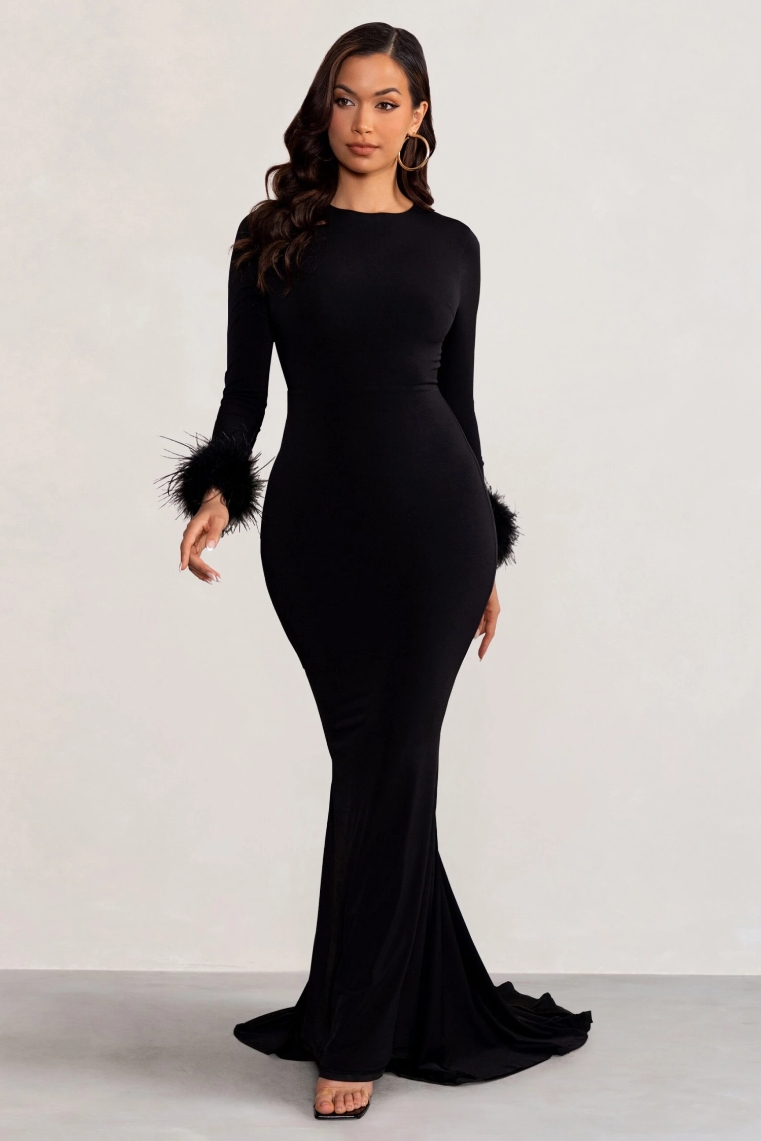 If you’re falling for all things feathered this season then you will love our latest black maxi dress, Betty. Crafted from premium stretch jersey, this figure-hugging dress features a high neckline, long sleeves trimmed in feathers and a fishtail skirt that’s anything but understated.