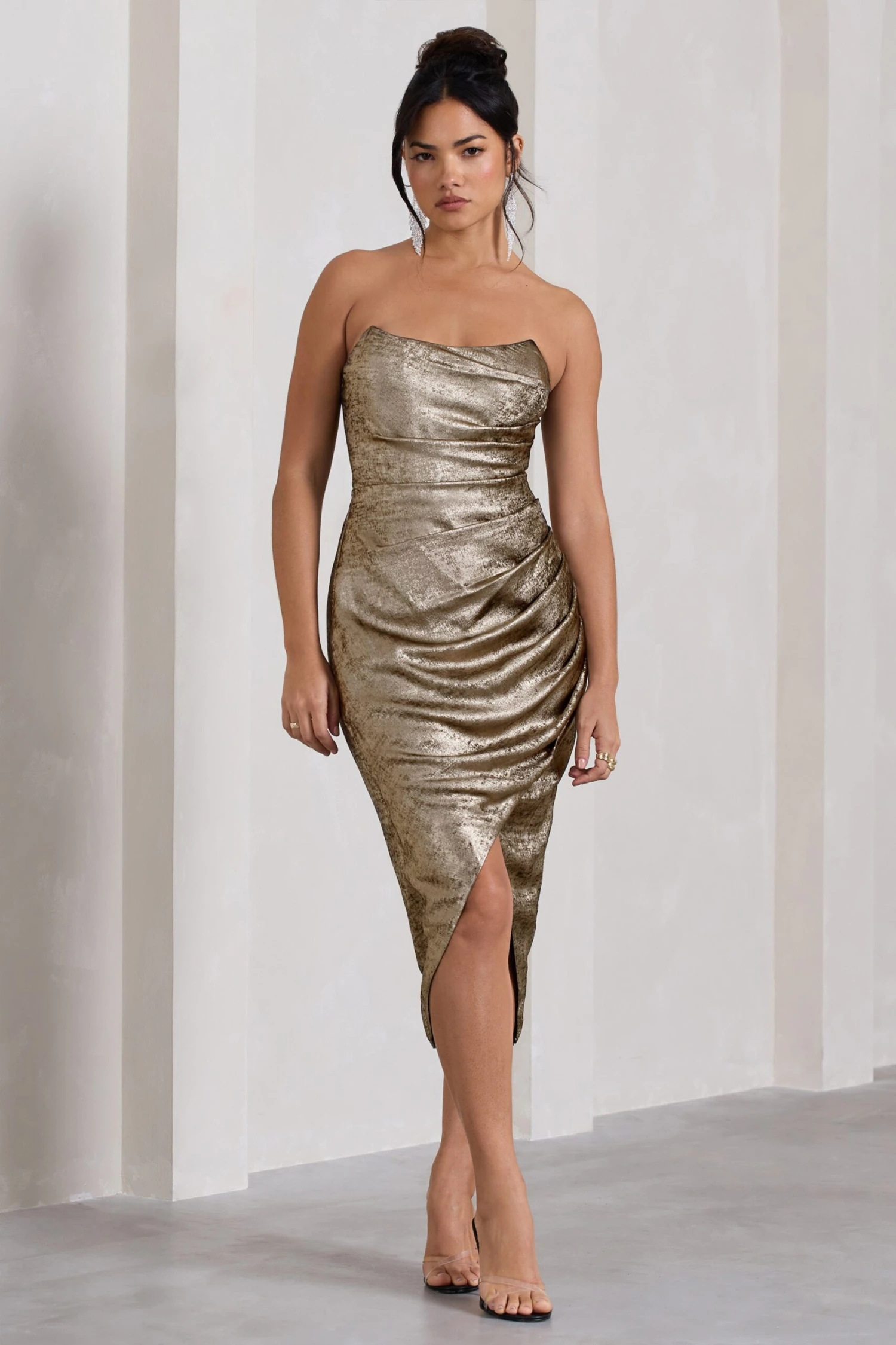 Crafted in a glistening gold metallic, Blizzard is sure to leave a lasting impression at any event. Carefully cut in a curve-accentuating wrap silhouette, this strapless midi dress features a curved bandeau neckline and daring high-leg split. Styled with some statement earrings, Blizzard would make the perfect pick for your next cocktail party or girls night out.