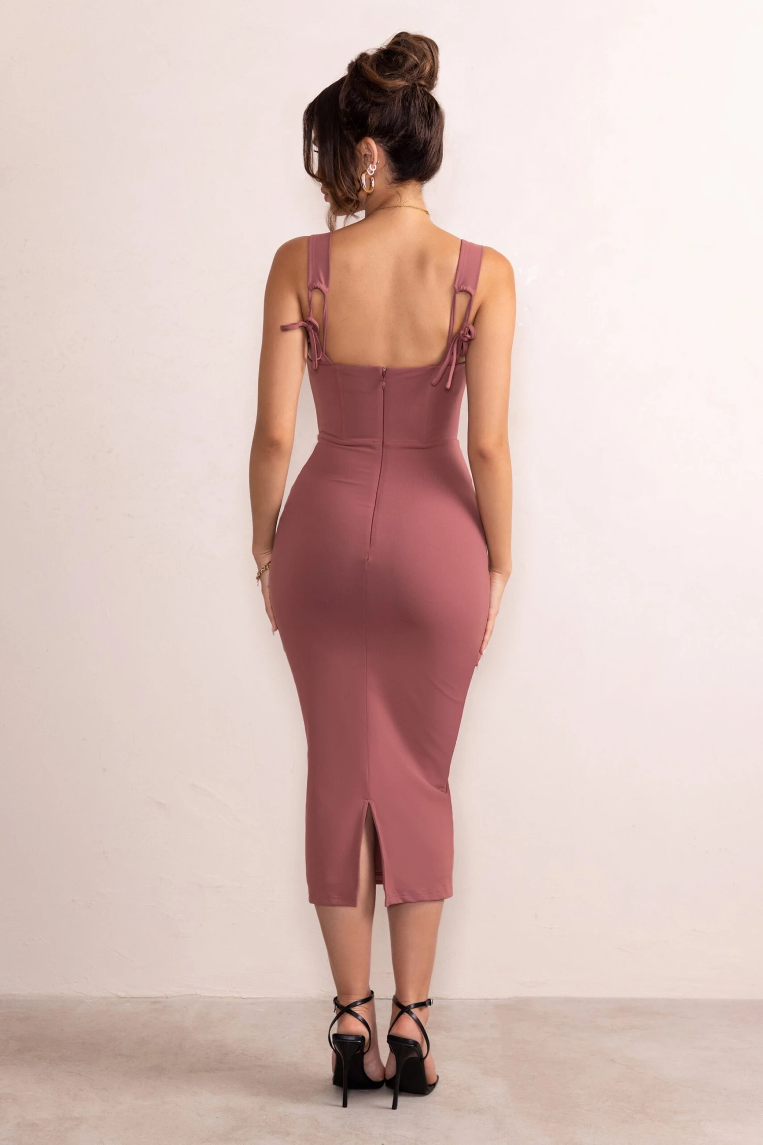 Bring your winter styles to new heights with our beautiful Charming midi dress. Carefully designed from our luxe jersey fabric in a gorgeous terracotta hue and with a sophisticated square neckline to reveal your feminine decolletage. The double-strap brings prime support and the corset bodice is waist-cinching creating an hourglass silhouette that falls in a beautiful body-contouring skirt with a hem split. This is the perfect dress for your birthday party, glam night out or special event coming up. Shift your statement wardrobe with this gorgeous dress!