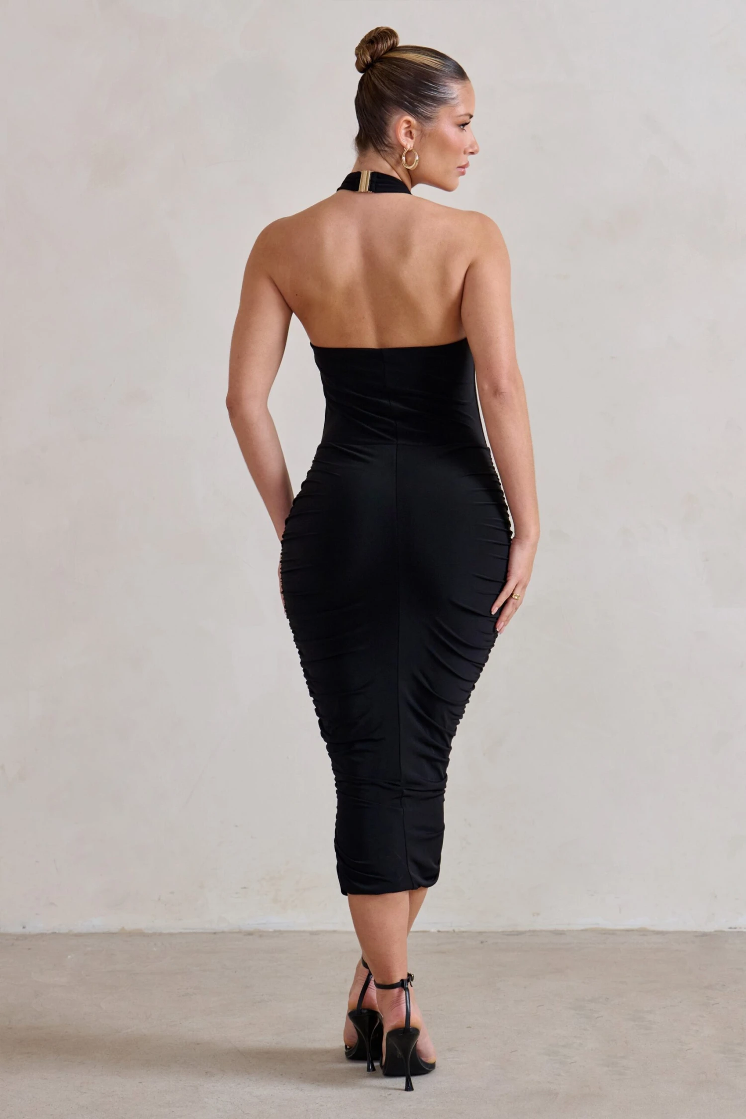 From birthday drinks to ballroom weddings, our Chrissy midi dress will always command attention. The classic black bodycon arrives in premium stretch jersey with a high halter neckline, open back and fitted ruched skirt. Pair Chrissy with encrusted accents to catch party lights as well as prying eyes.