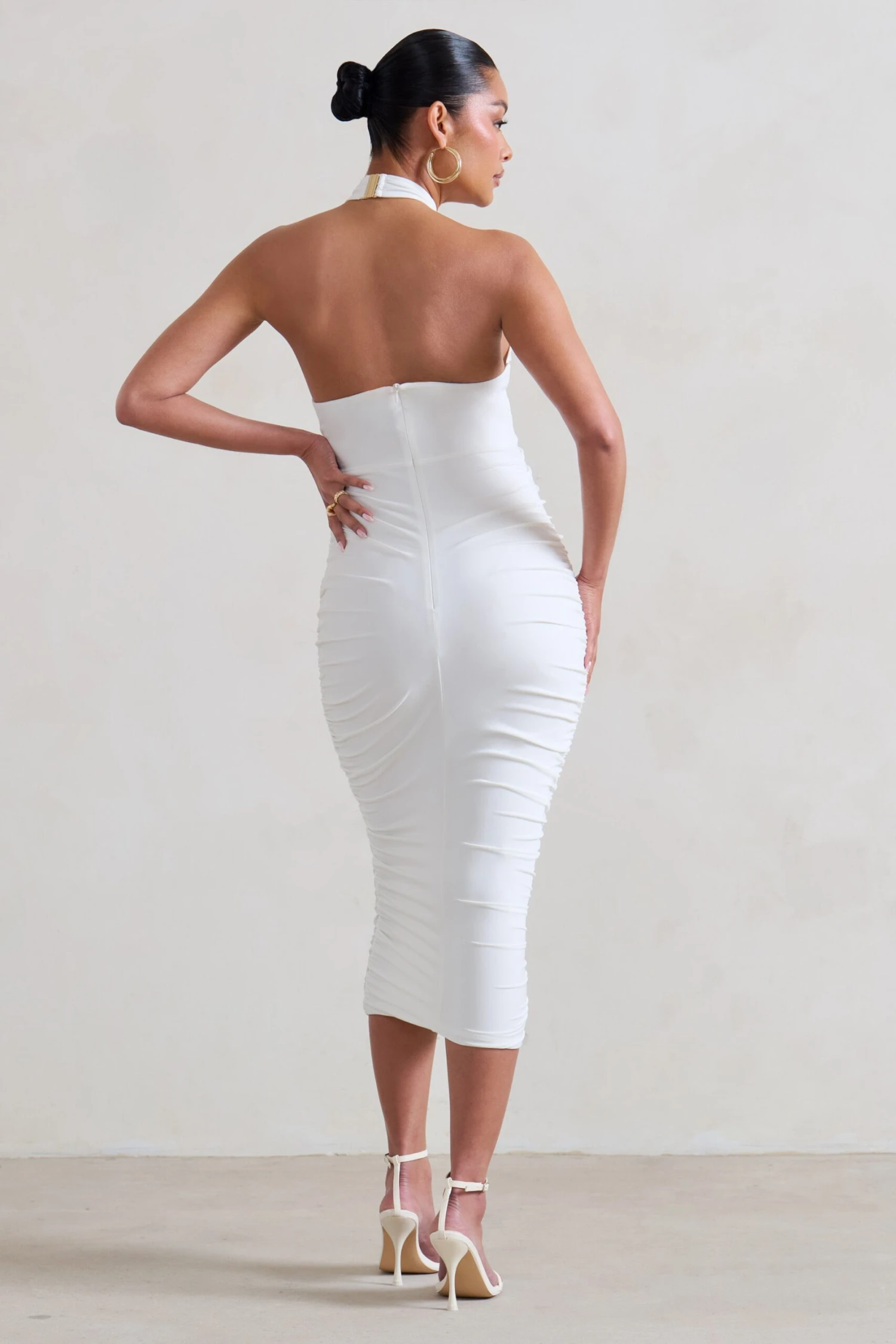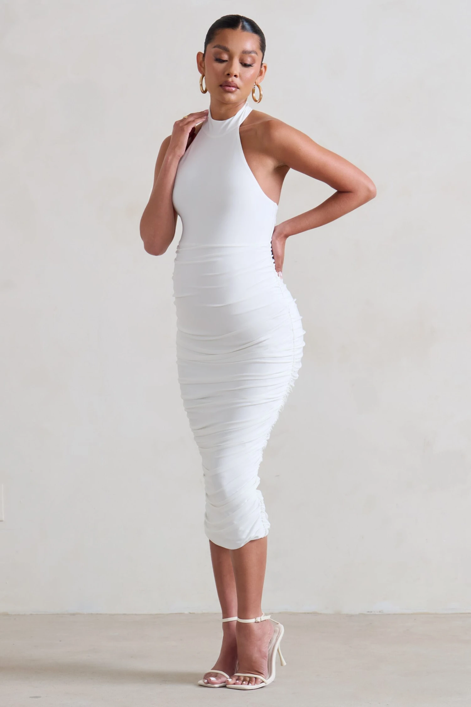From birthday drinks to ballroom weddings, our Chrissy midi dress will always command attention. This white maternity dress arrives in premium stretch jersey with a high halter neckline, open back and fitted ruched skirt. Pair Chrissy with encrusted accents to catch party lights as well as prying eyes.