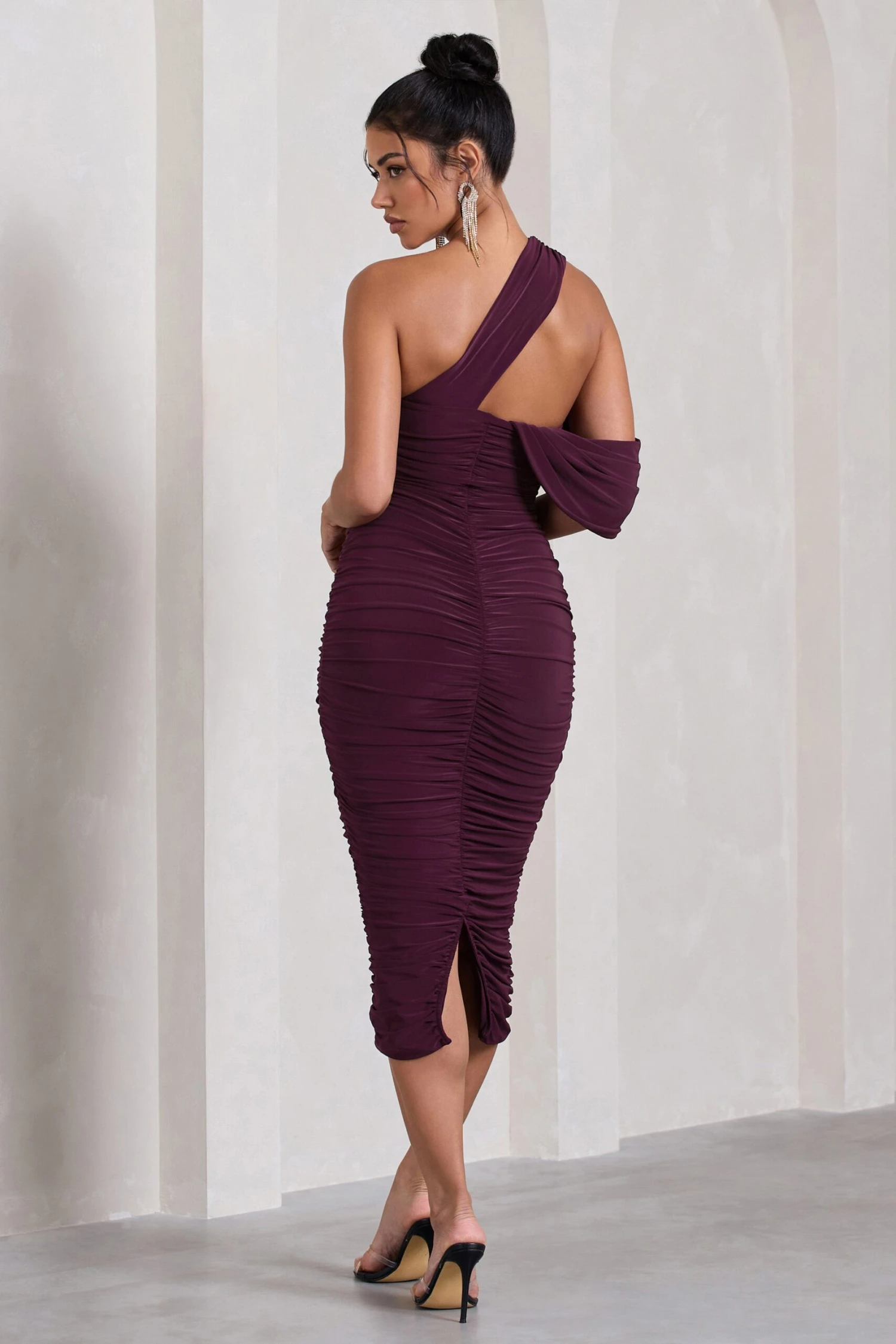 Whether you have an extravagant wedding or evening drinks on your agenda, our Cici midi dress will make your attendance unforgettable. The asymmetric must-have arrives in a rich plum jersey with flattering ruching all over its bodycon silhouette. Cici also features a statement off-shoulder sleeve and a sculpting skirt with a subtle rear split.
