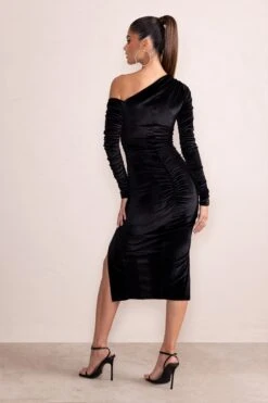 Meet Cora, our versatile midi constructed in a timeless, sophisticated silhouette. Wrapped in a premium stretch velvet, this blue square-neck midi is enhanced by flattering full body ruching and wide shoulder straps. For the perfect work party ensemble, try pairing Cora with some strappy stilettos.