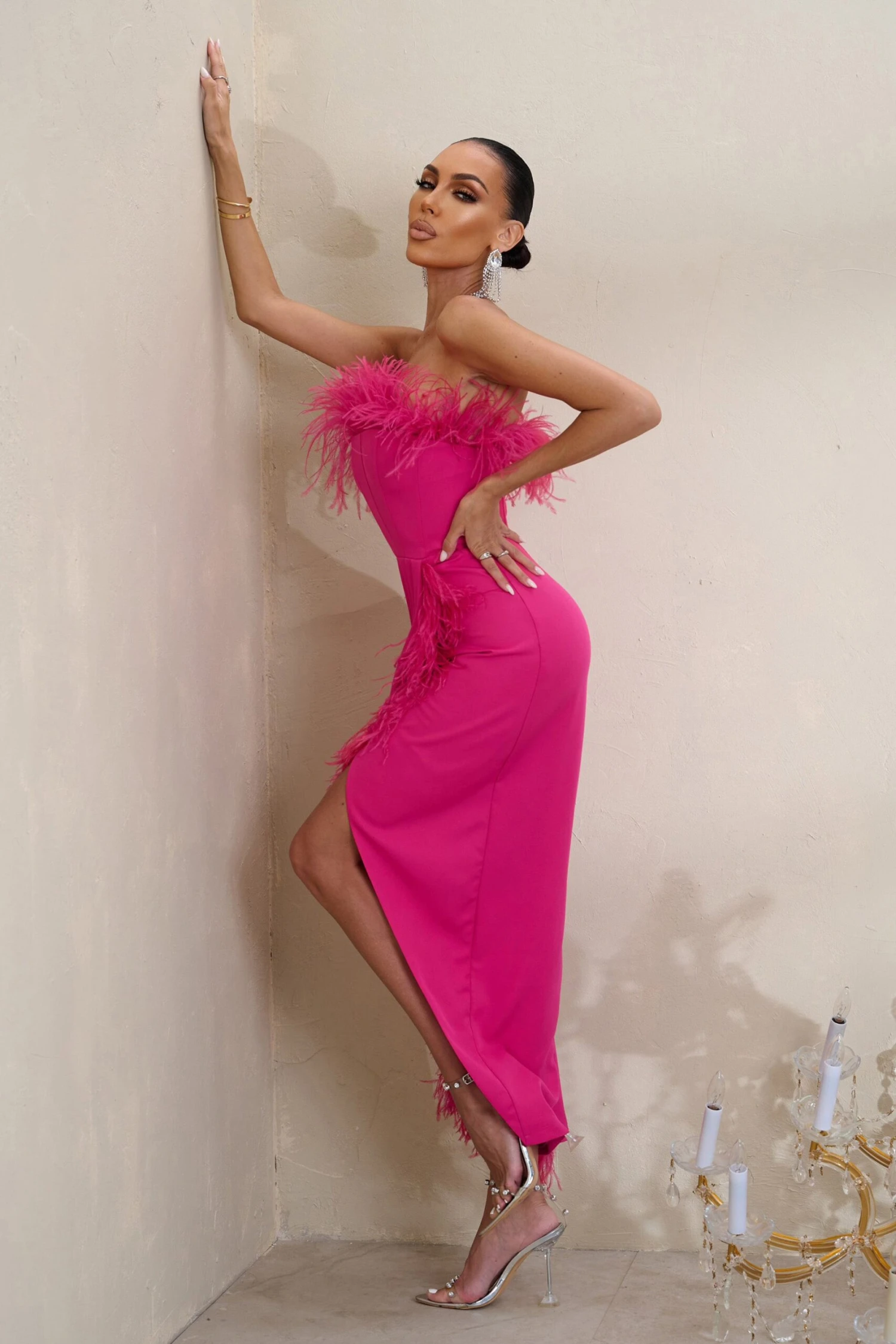 Pour yourself a cosmo cocktail and get ready to party in this aptly-named maxi dress. As sweet and enticing as the drink itself, our Cosmo gown is made from hot pink crepe in a corseted wrap silhouette with fine feather trims. Pair this strapless maxi dress with silver hoops for an unforgettable birthday or bottomless brunch look.