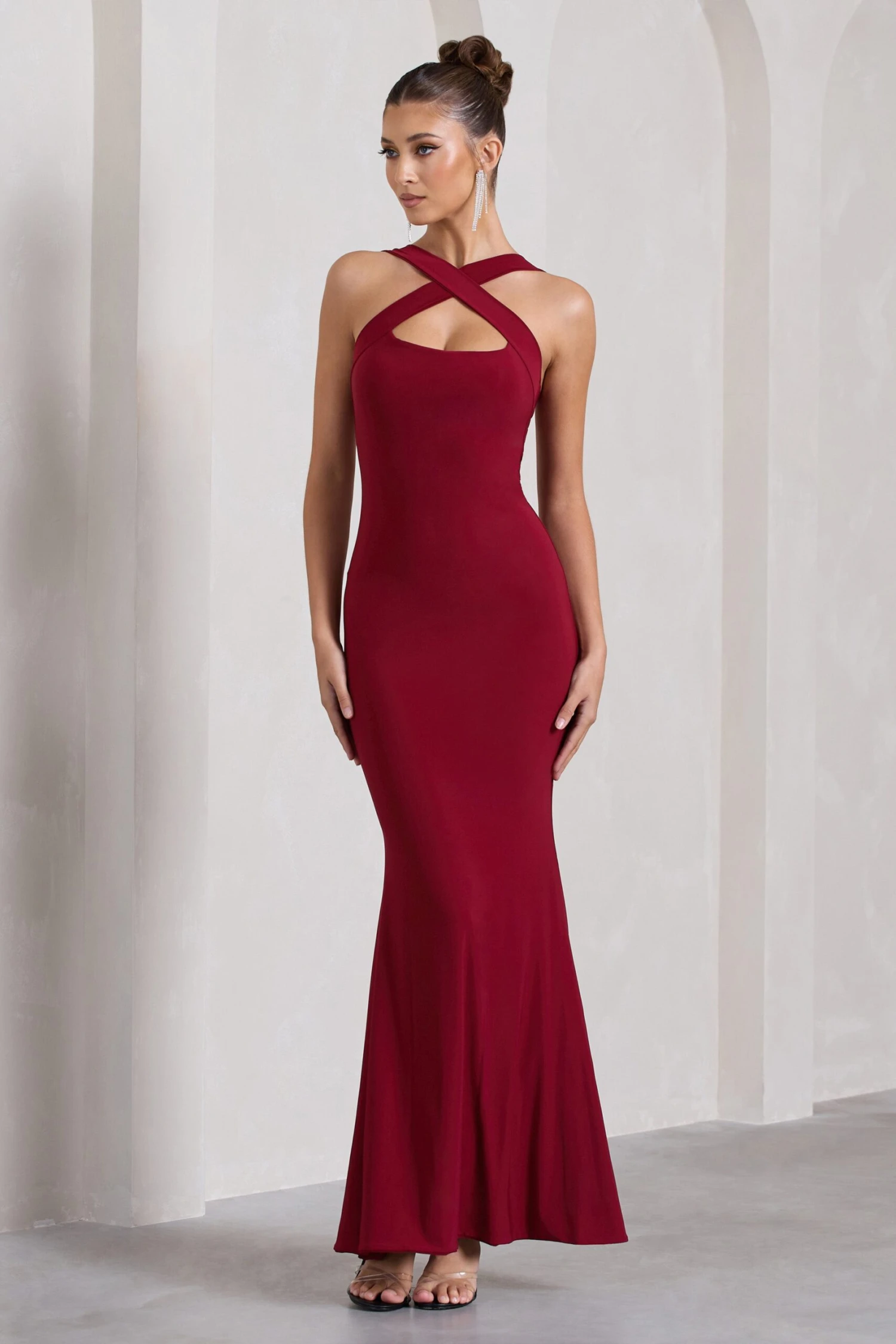 Carefully cut in a premium stretch jersey that clings to each curve, this berry maxi dress is as flattering as it is flawless. Detailed by delicately criss-crossing straps, Cross My Heart is the epitome of understated glamour. For the perfect wedding guest look, try complimenting this halter-neck dress with a sleek bun and gold accents.