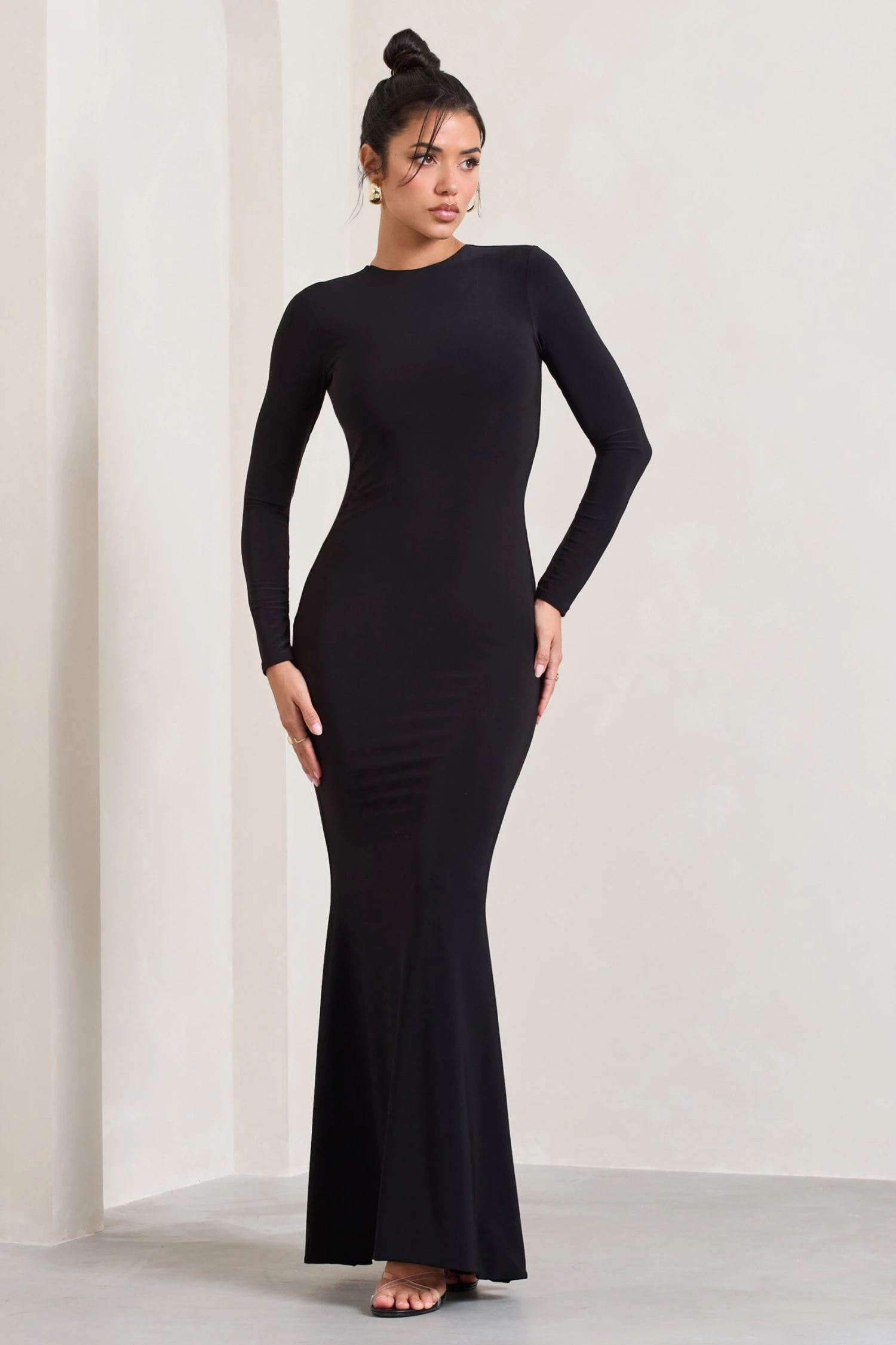 Refresh your formal wardrobe with this seasons coveted maxi Donna. Crafted in a sculpting premium black jersey, this long-sleeved dress is defined by its open-back and twist detail. Try pairing this elegant staple with a sleek bun and gold earrings to create an effortless look.Â