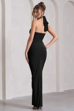 Expose | Black Satin Sweetheart Corset Asymmetric Maxi Dress