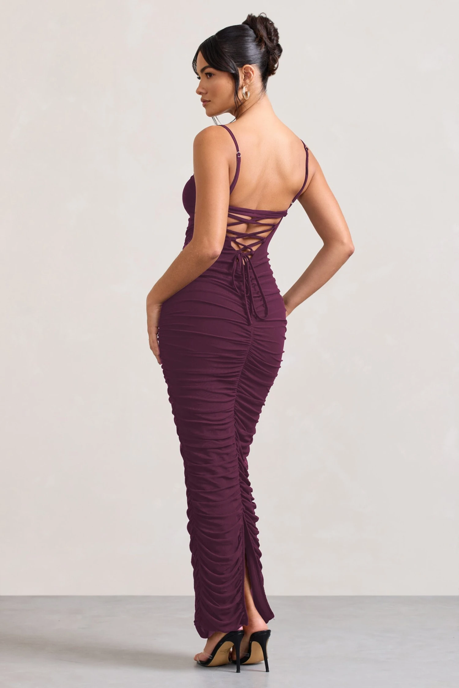 Ellis is a classic, mesh-layered maxi to see you through every social occasion this season. Framing your figure in a fully-ruched stretch fabric, this plum bodycon dress is characterised by a straight neckline, delicate straps and a lace-up back. Style Ellis with understated accents to keep all eyes on your cinched silhouette.