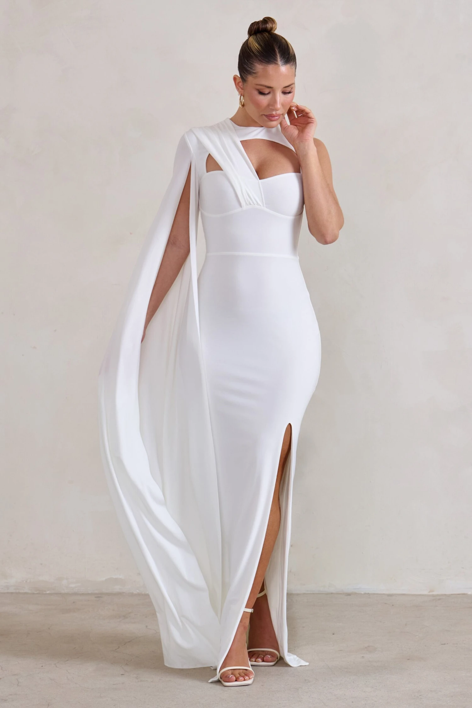 You’ll remain on everyone’s mind long after the party is over if you show up in our stunning Emmey dress. Luxuriously made from premium white jersey with some stretch to sculpt and contour your curves, this sweetheart maxi dress features a boldly draped bodice that carries into a floor-sweeping cape sleeve. Classic in colour but contemporary in silhouette, Emmey is the dress your formal wardrobe deserves.