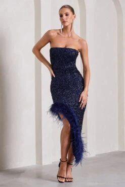 Be the centre of attention at your next night out with Emulate, our aptly-named navy maxi dress. Showered in a figure flattering sequin, this piece features a romantic asymmetric skirt thats finished with delicate feathers. Emulate would be the perfect party dress paired with a sleek bun and statement earrings.
