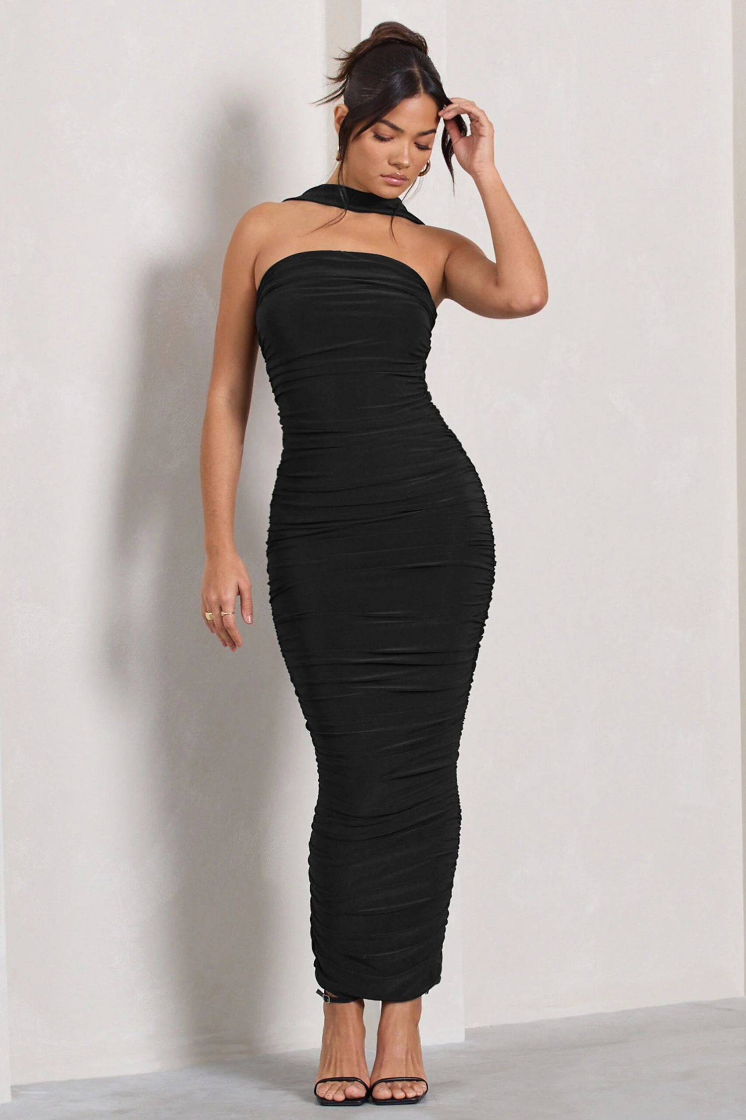 Be the first to review “Entranced | Black Ruched Bandeau Maxi Dress With Halter Collar” Cancel reply