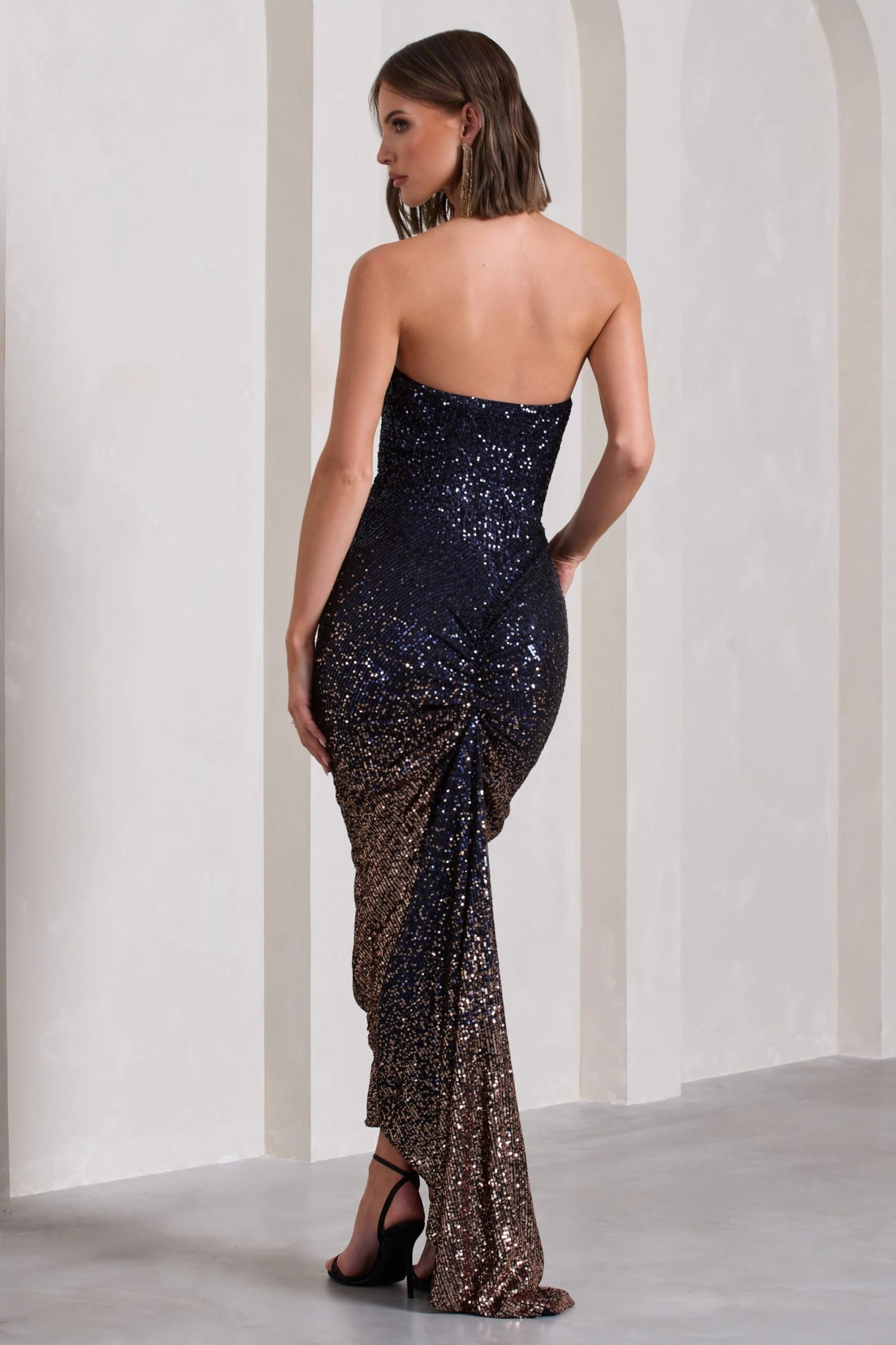 Made for maximum impact, our Fade maxi dress is crafted in an ombre sequin silhouette that shimmers with every move. Fading from a rich navy shade into a gold godet-inspired skirt, this strapless maxi is the perfect statement piece for this party season.Â