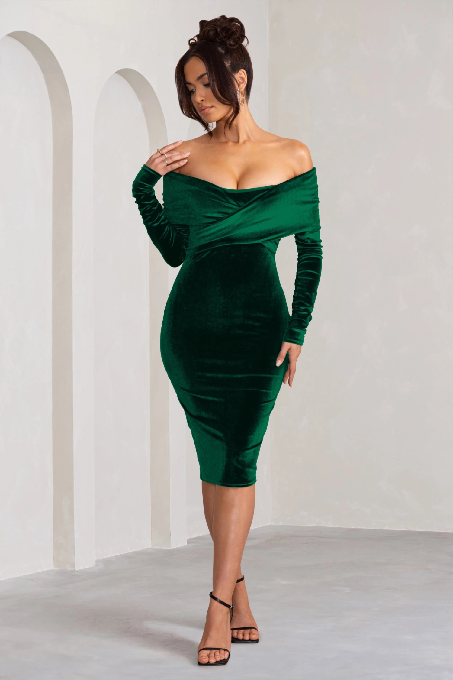 Show off your curves with this must-have dress. Our gorgeous Flatter Me midi dress features ruched velvet fabric that enhances your figure, whilst the off-the-shoulder neckline with twist front detailing elegantly emphasises your decolletage. A staple piece, this dress perfectly captures understated glamour with its long sleeves, midi cut, and figure-enhancing shape for an undeniably sophisticated look. Turn heads at your next VIP event, birthday party, or black-tie event with Club L.