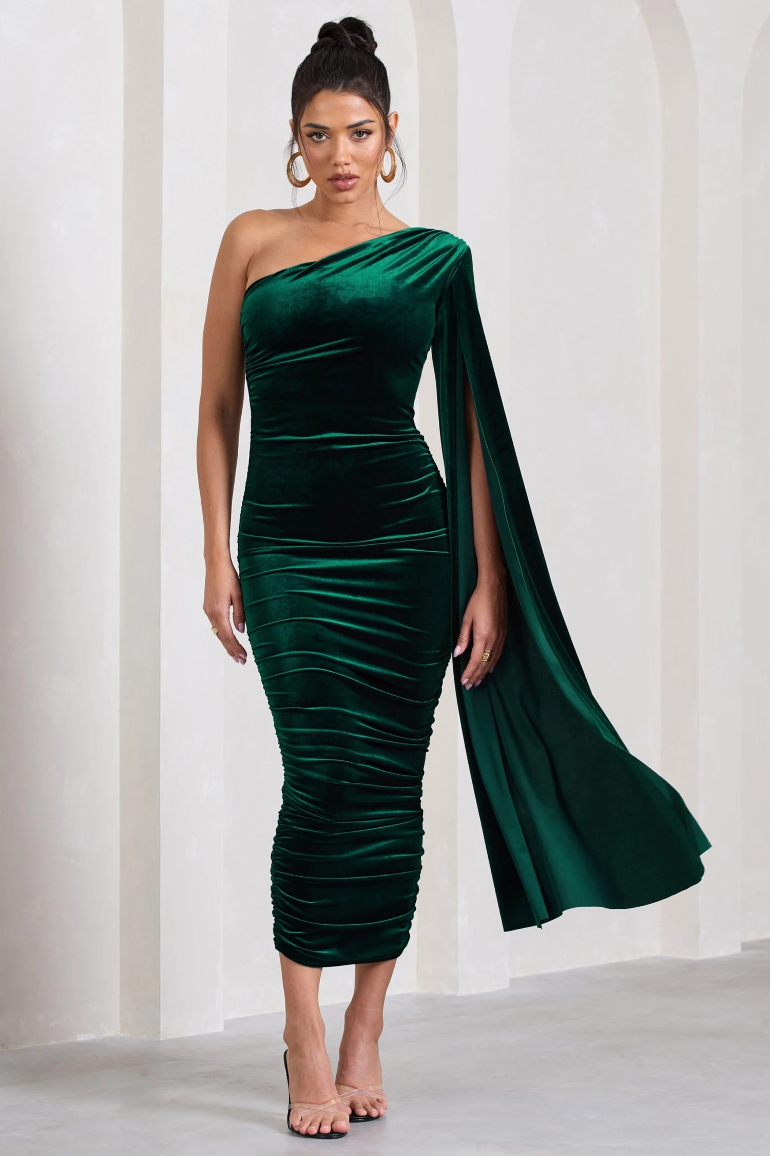 Crafted in an opulent stretch velvet, this one-shoulder midi is a formal must-have this party season. Arriving in a rich green shade, Gianna is detailed by an extravagant singular cape sleeve and flattering full body ruching. Try styling this bodycon dress with some strappy stilettos for the perfect work party ensemble.Â