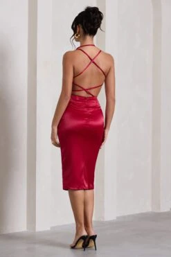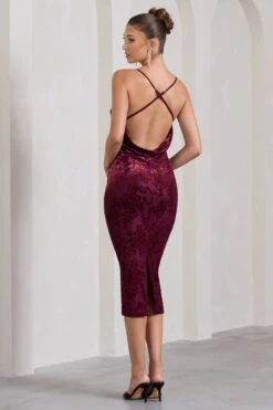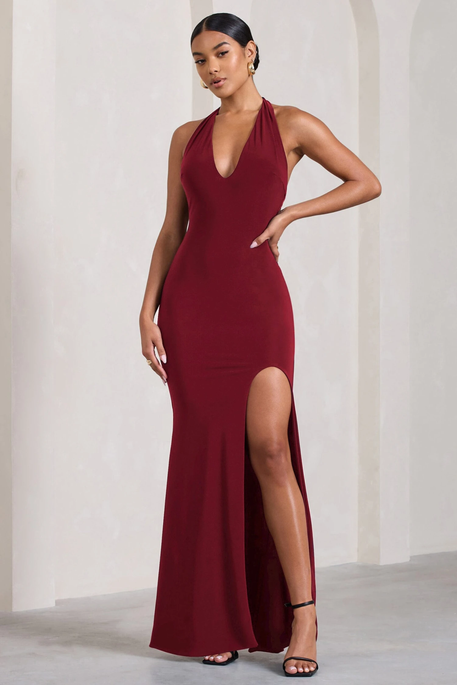 Give wow factor in our aptly named maxi dress Glamour. This berry maxi dress delivers effortless luxury, cut in a premium stretch jersey that sculpts your curves to perfection. This style showcases a feminine plunge neckline with a self-tie halter and elegant open back. Add Glamour to your evening repertoire and style this dress with a sleek bun and some strappy stilettos.Â