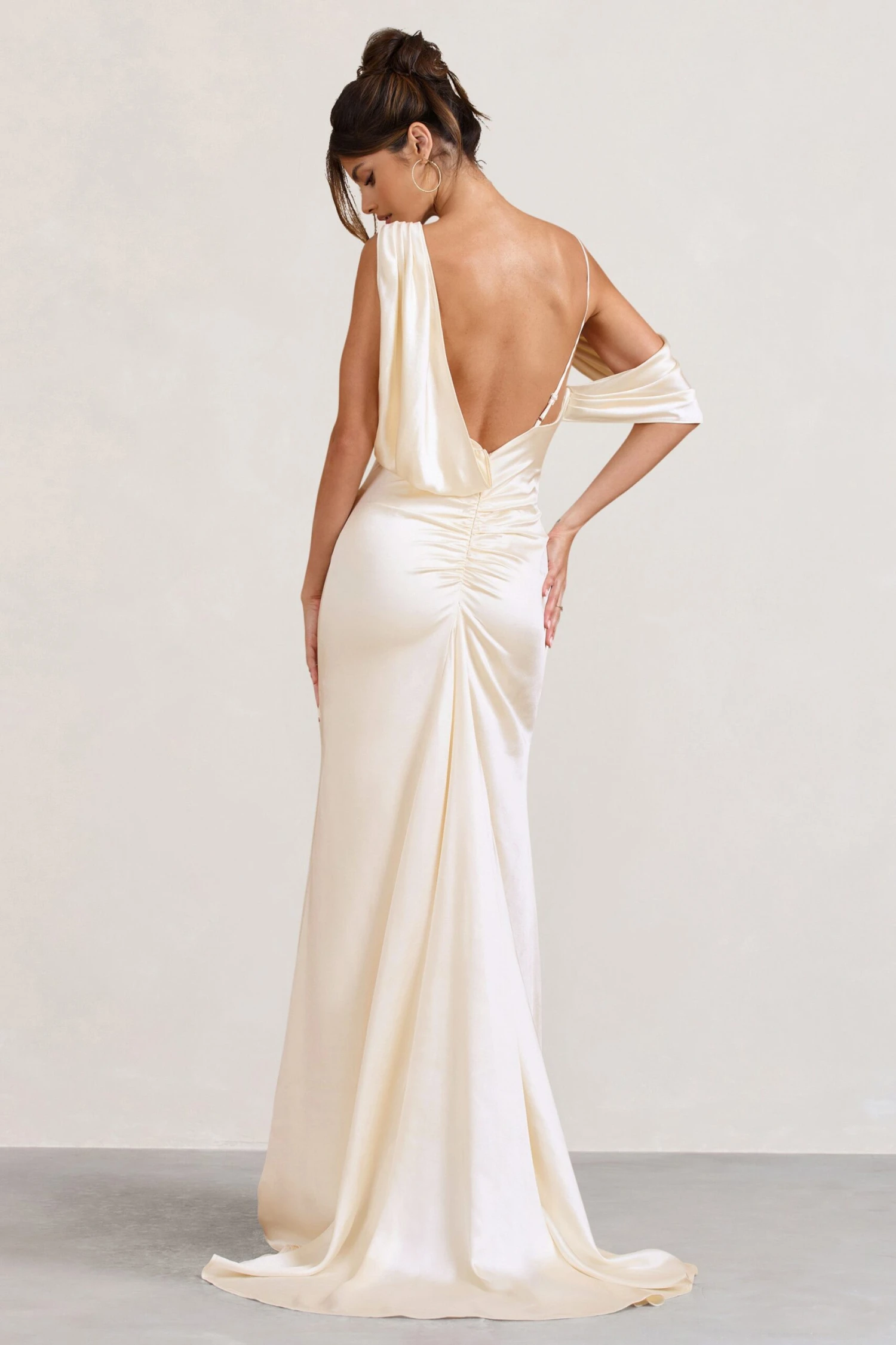 Whether you’re attending a wedding or a black tie event, make a memorable entrance in our Jayne maxi dress. This floor-sweeper is cut from luxurious cream satin in an asymmetric silhouette that feels classic yet contemporary. Finished with a thigh high split, this draped maxi dress would look especially elegant with tousled hair and strappy stilettos.