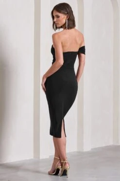 Arriving in a timeless, sophisticated silhouette, Joanna is this party seasons must-have. Curated in a luxurious stretch velvet, this sculpting black midi dress features a demure high neckline, alluring open-back and flattering ruching throughout its skirt. For an elegant work party attire, try styling Joanna with some diamante earrings and strappy stilettos.Â
