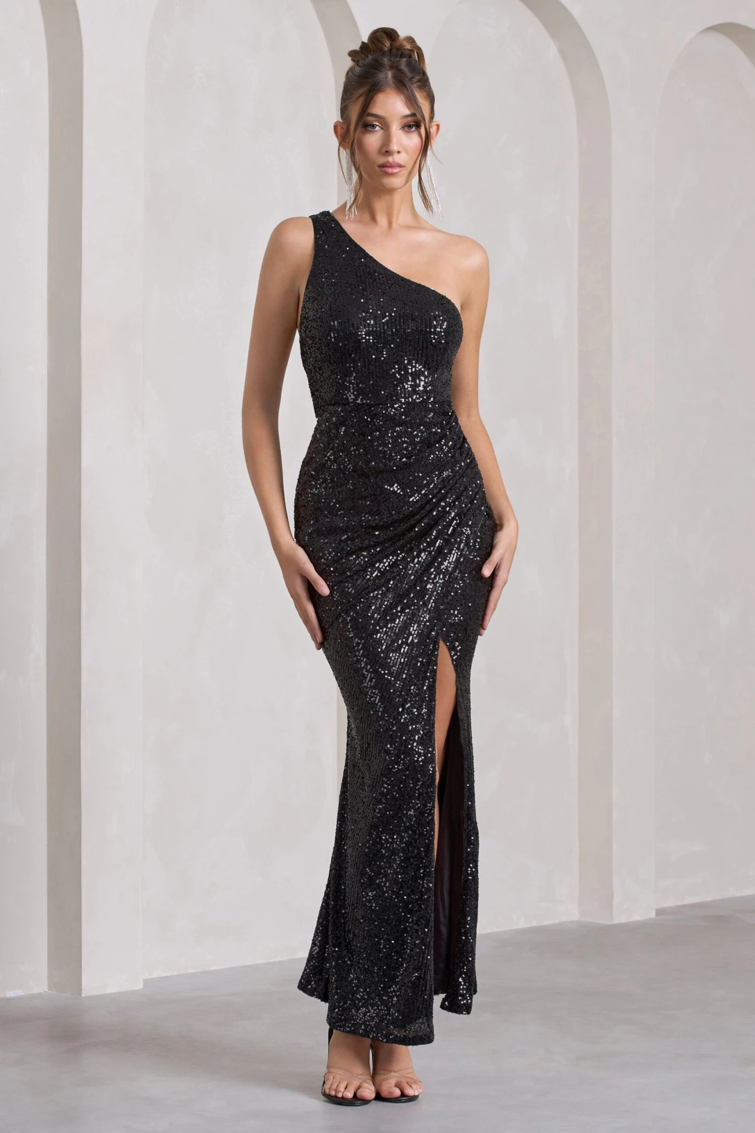 Turn heads in Juliet. This asymmetric, one-shoulder sequin gown is a certain showstopper. Featuring ruched detailing around the middle to cinch in the waist, a dramatic thigh split, and asymmetric plunge back detailing, Juliet is as captivating from the front as the back. Crafted in a classic black sequin, this dress will make a statement at your next black-tie event.