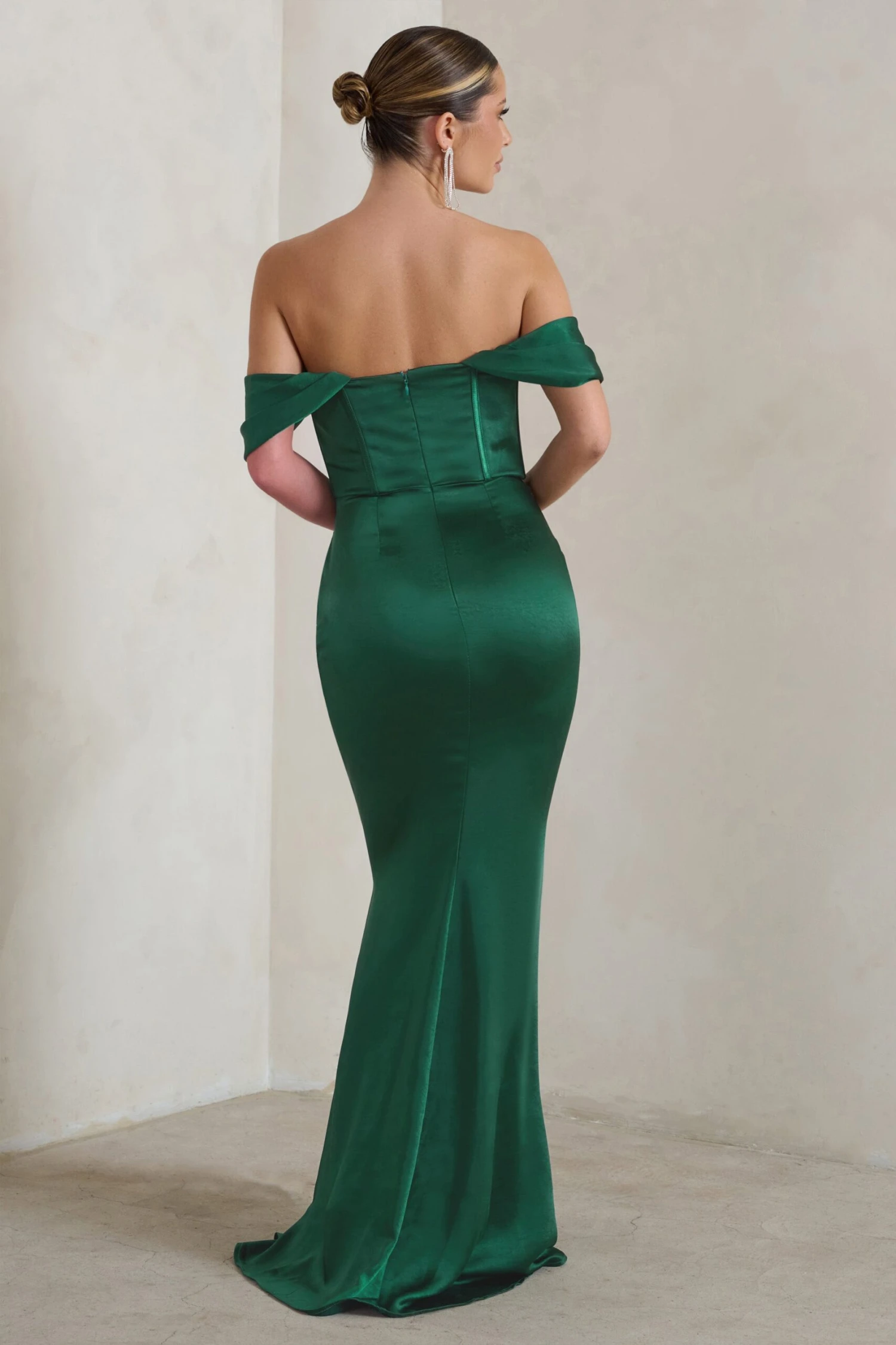 Be the first to review “Kimberly | Bottle Green Bardot Fishtail Satin Maxi Dress” Cancel reply