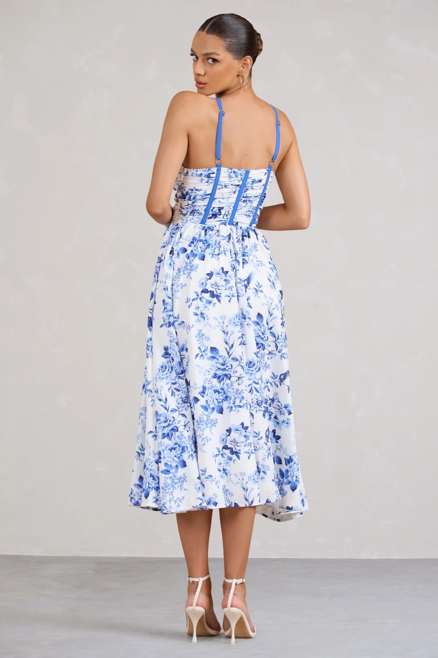 We’ve designed the only midi dress you need this summer and her name is Lady Loren. Softly shaping your figure in a lightweight woven fabric, this blue floral dress presents a ruched corset strung by slim crossing straps as well as a split calf-length skirt. Style this midi dress with a sleek bun and gold hoops for an effortless look ready for all summer occasions.