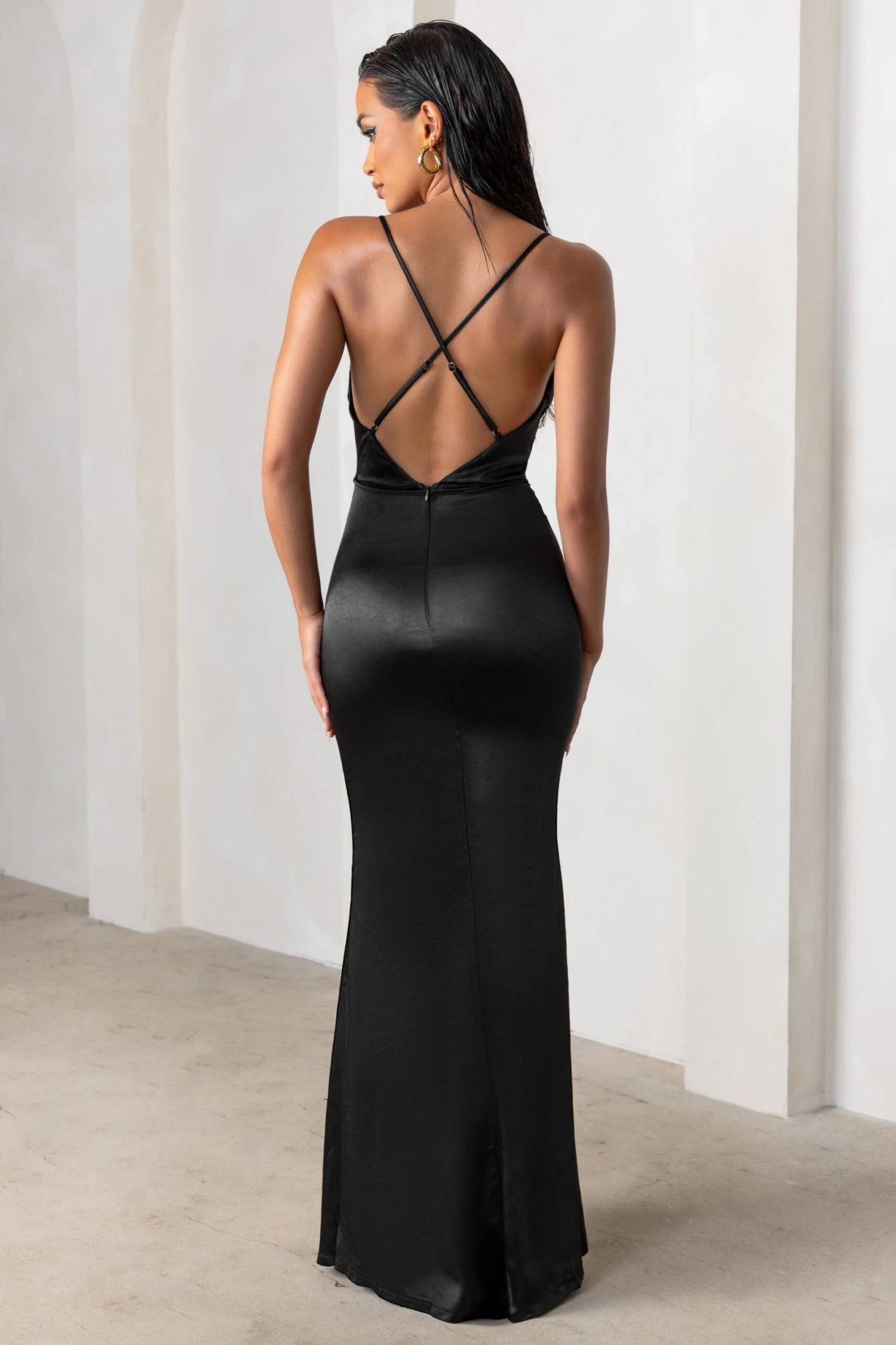 Whether you’re a guest at a wedding or black tie event, you’ll exude elegance in this black satin showstopper. Cascading effortlessly over your curves, our Lifetime maxi dress features a draped cowl neckline and slim shoulder straps that cross over an open back. More delicate details include a string belt that accentuates your waist subtly.
