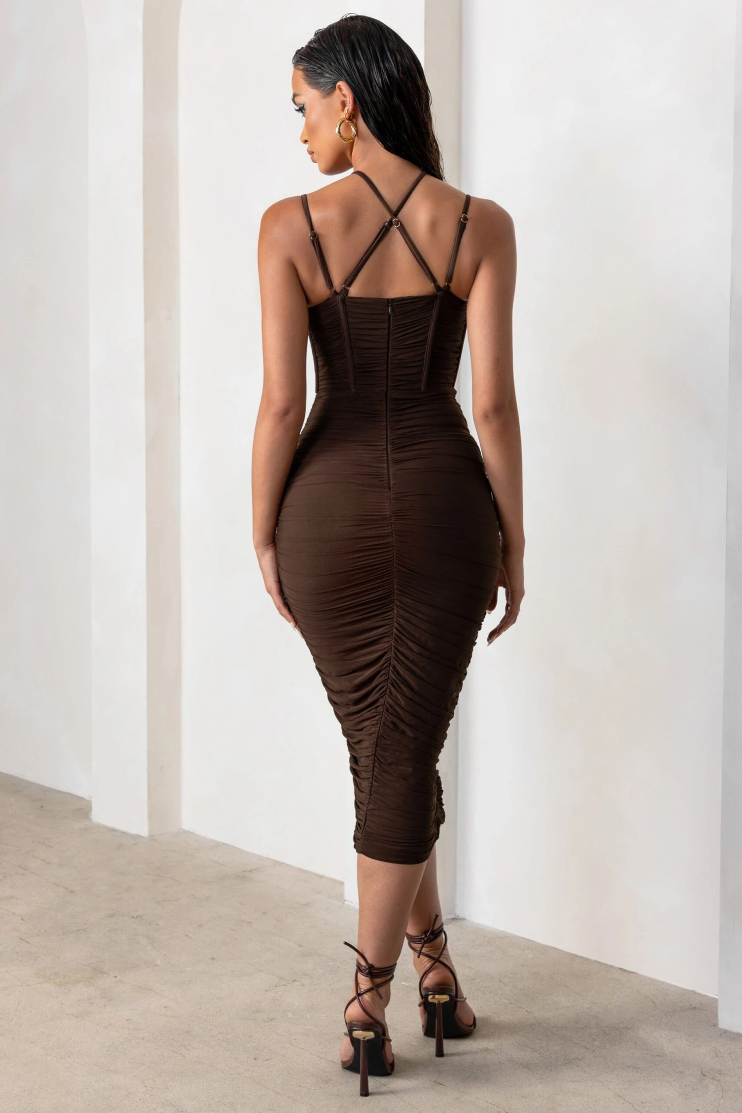 Set to impress this season with our iconic Liveliness midi dress in a gorgeous mocha shade. Featuring a halter neckline with a soft mesh overlay for a bold look, delicate cami straps that elegantly finish in a cross-back detail, and a waist-cinching corset bodice to enhance your hourglass figure. Style this gorgeous midi with heeled sandals and get ready to make an entrance at your next glam night out, birthday party or black-tie event. Stunning is an understatement for this flattering look!