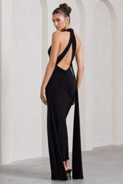 Our newest black midi Liz is the perfect combination of a classic silhouette with a new season edge. Made in our premium jersey structured to cinch your natural curves, this bodycon is transcended by a self-tie sash, striking open back and flattering ruching. For an elevated party-ready look, try styling Liz with a tousled bun and statement earrings.