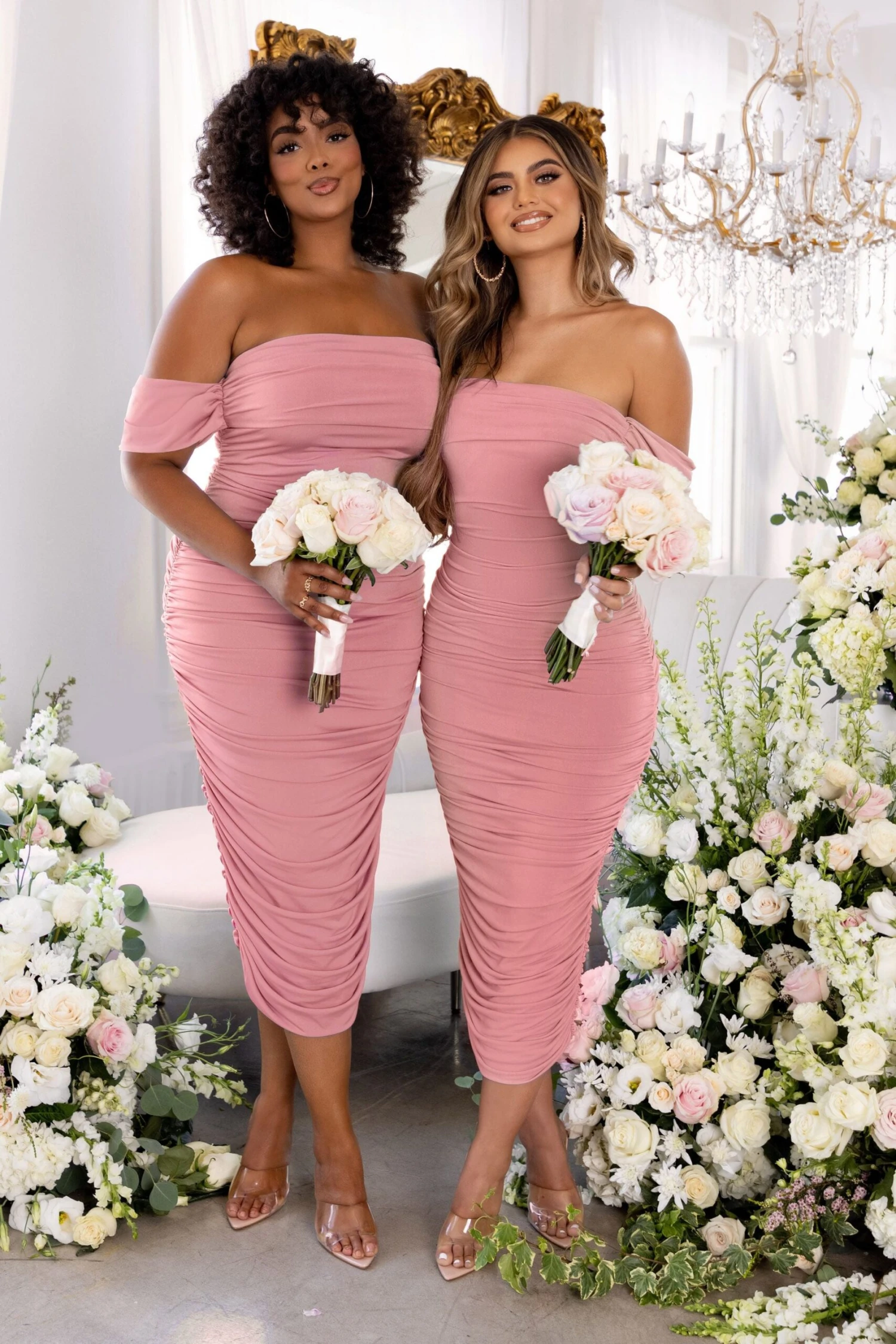 Leave wedding guests lost for words in this aptly-named midaxi dress. Designed in a breathtaking Bardot silhouette, Lost For Words boasts a bodycon fit made from stretchy ruched jersey. Style this nude off-shoulder dress with simple accessories like clear slip-on pumps and let your sculpted curves be the overall focus.