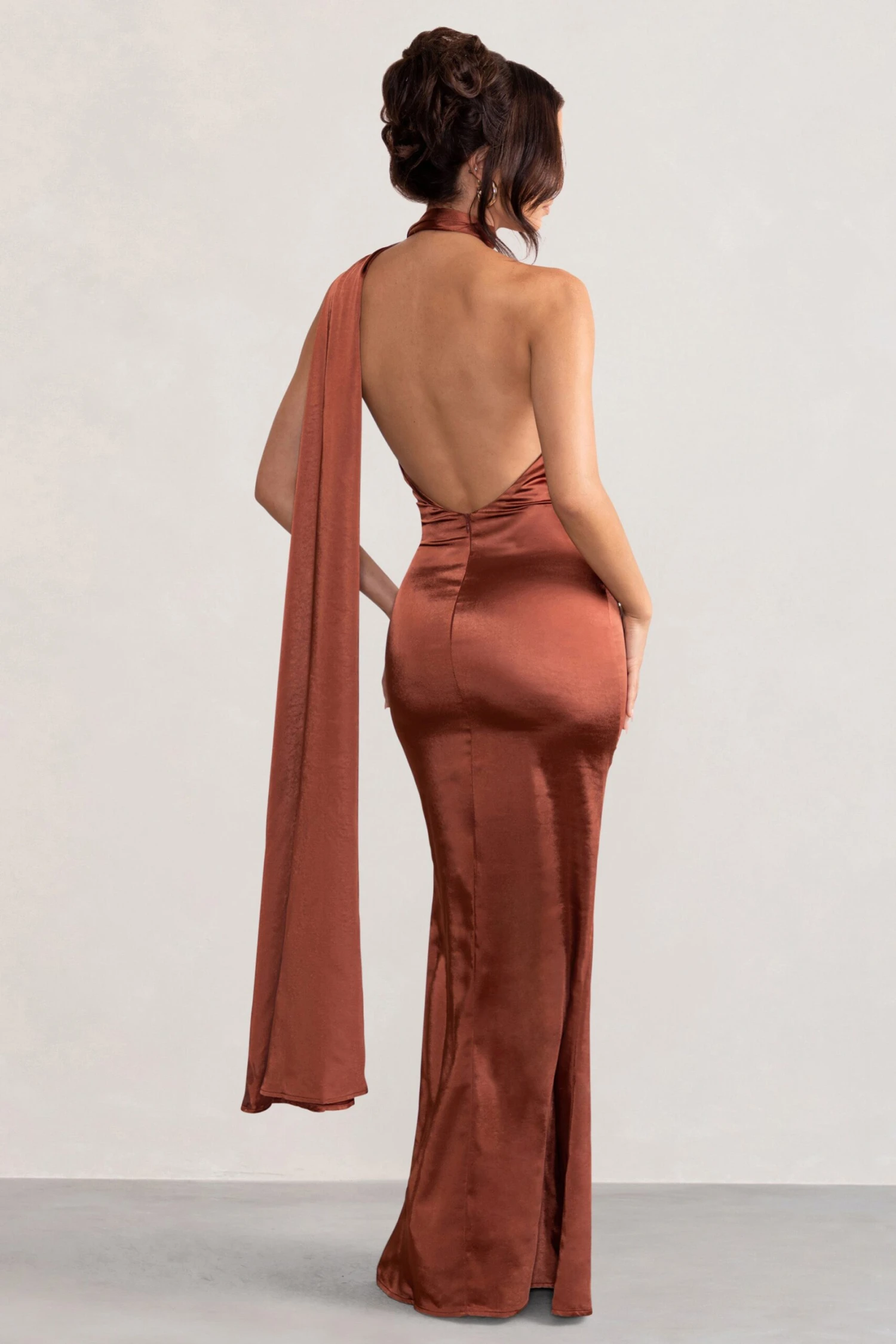 Make the most of every occasion in our beautiful Mademoiselle maxi dress. With a feminine asymmetric scarf neck that elegantly falls down the super feminine cowl back detail, this dazzling rust satin design is pure sophistication. You will look stunning in this gorgeous rust gown at your next VIP party, black-tie or gala event.