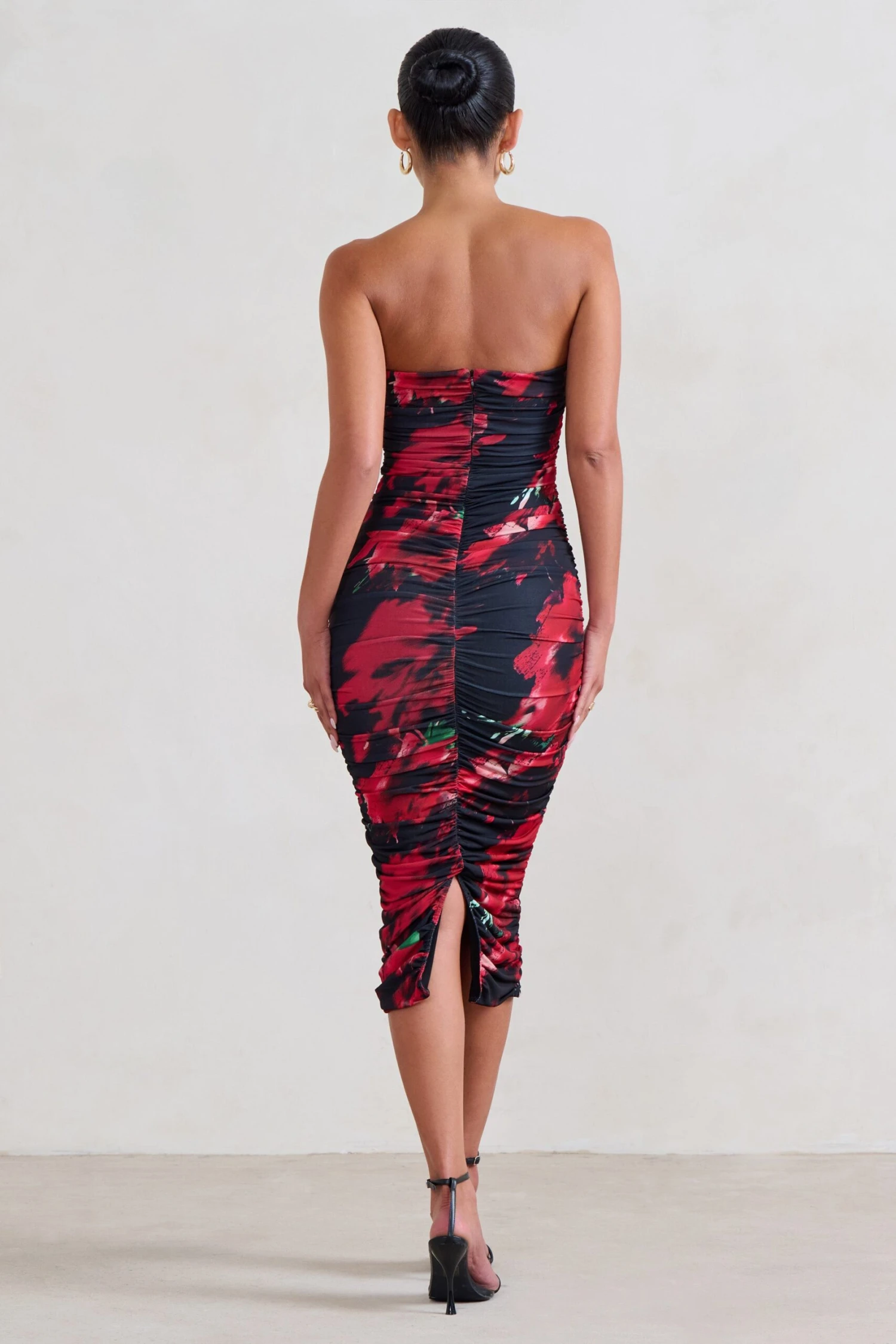 Meet My Girl, a captivating midi dress designed to contour your unique curves. Crafted in our signature stretch jersey and wrapped in a layer of ruched mesh, the black and red bodycon features a strapless bandeau bodice and a split to the rear of a calf-length skirt. Pair this printed dress with warm gold accents for an effortless birthday or date night outfit.