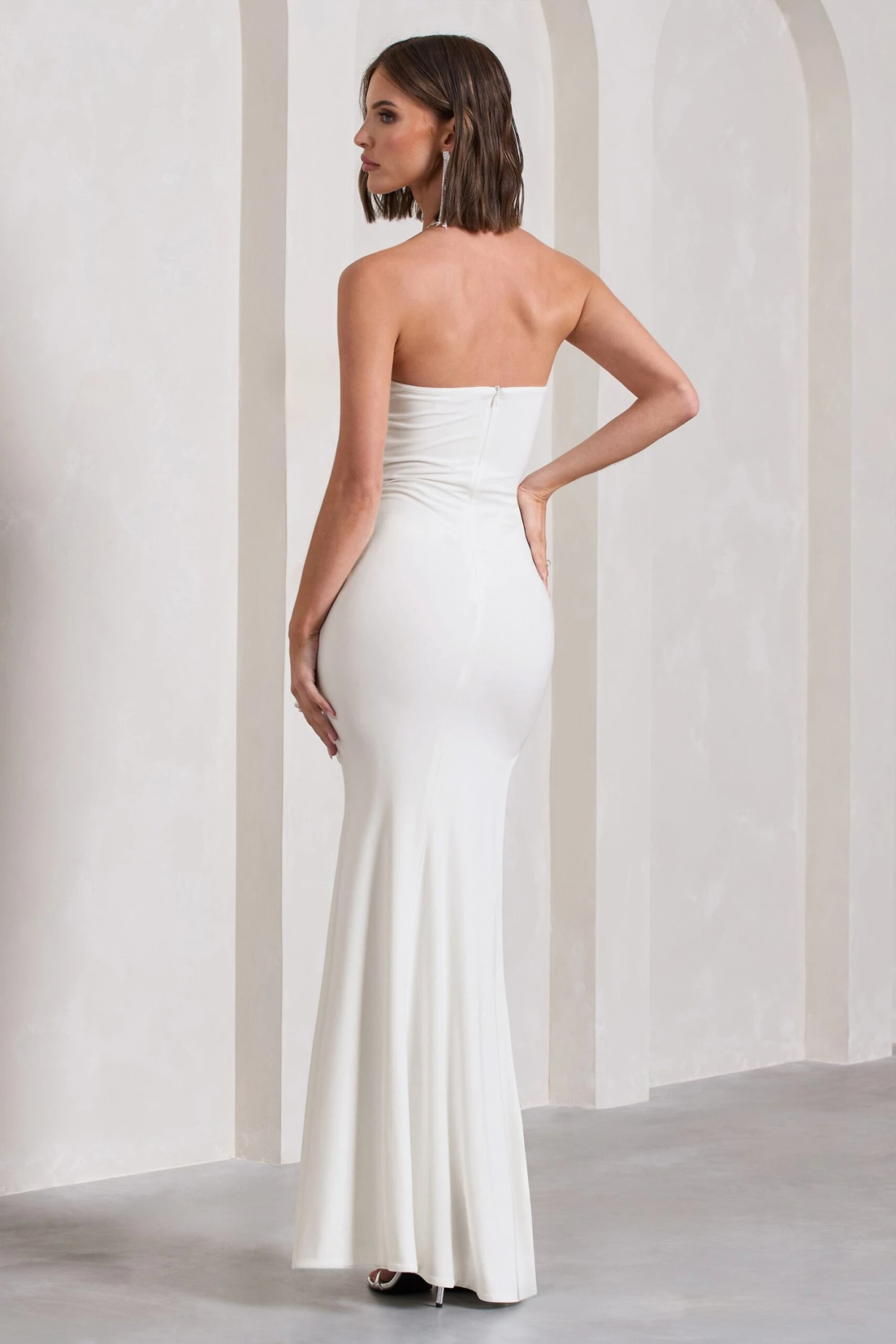 Simple yet graceful, our latest white maxi dress is the epitome of understated glamour. Crafted in a curve-contouring premium jersey, My Muse is defined by its strapless neckline, floral corsages and high-leg split. For a timeless prom ensemble, why not pair this white maxi with some statement accessories?