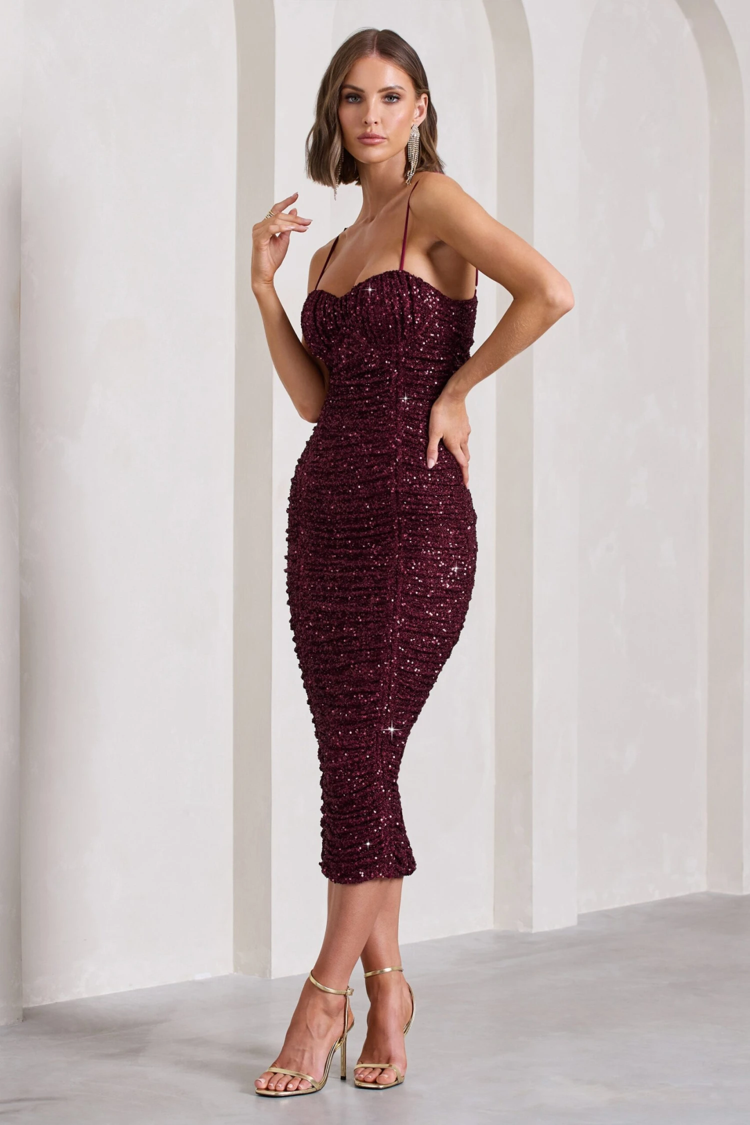 Saturated in sparkling sequins, New Energy is sure to make heads turn at your next event. Arriving in a fully ruched bodycon silhouette, this figure-skimming midi dress offers support through its wired padded cups and adjustable cami straps. For the perfect work party attire, compliment this plum piece with some gold heels like Rotation.