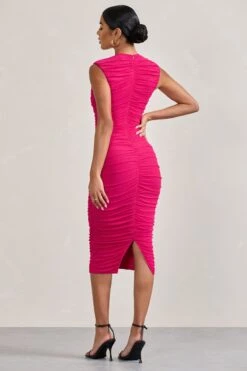Alight | Fuchsia Pink Ruched Mesh Sleeveless Bodycon Midi Dress