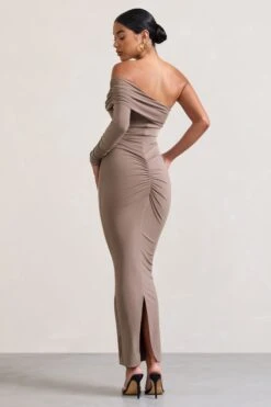Aletta | Burgundy Plunge Neck Ruched Midi Dress With Long Sleeves
