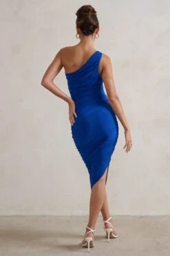 Dorit | Cobalt Blue One Shoulder Asymmetric Ruched Midi Dress
