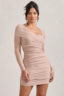 Sparks Fly | Nude Ruched Mesh Long-Sleeved Bodycon Mini Dress