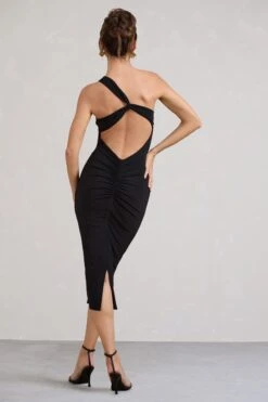 Treasured | Mocha Asymmetric Mesh Long Sleeve Ruched Midi Dress