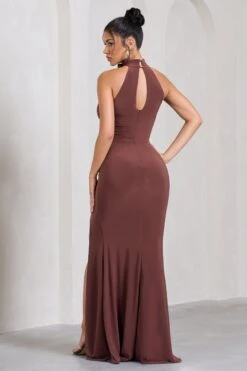 Wanderer | Chocolate Brown Ruched Halter-Neck Split Maxi Dress With Flower