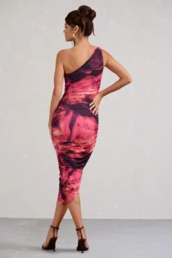 Dorit | Pink Print One Shoulder Asymmetric Ruched Midi Dress