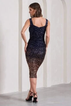 Starry Night | Navy Gold Ombre Sequin Square-Neck Midi Dress