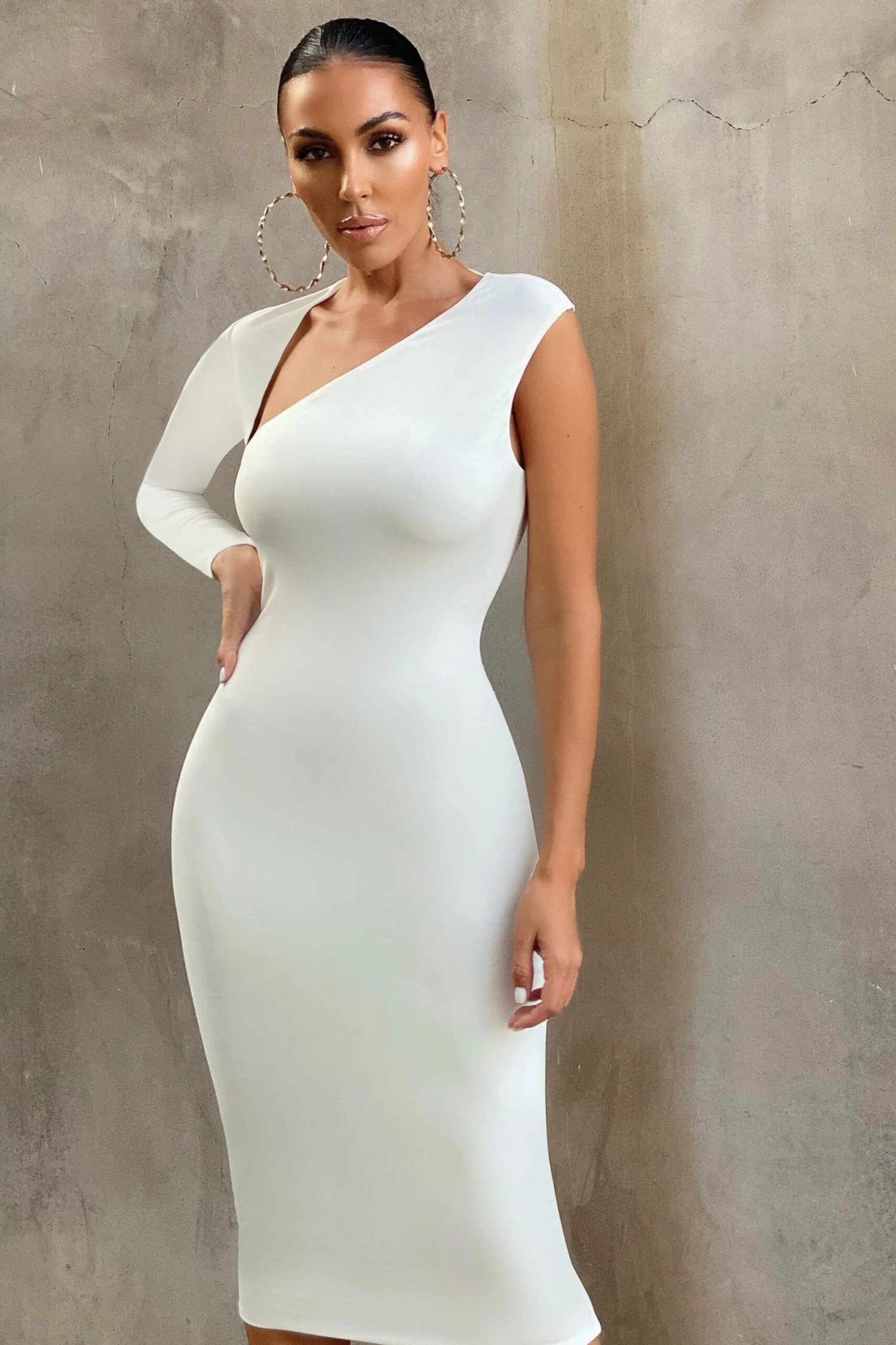 A party dress should flatter but never overpower your figure which is why we designed this aptly-named option, Refine. Crafted from our sculpting stretch jersey in an asymmetric silhouette that’s guaranteed to get you noticed, this white bodycon also features one long sleeve and a fitted midi skirt. Finish Refine with statement hoops for an enviable evening look.