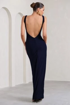 Kate | Navy Square Neck Maxi Dress With Plunge Back And Side Thigh Split
