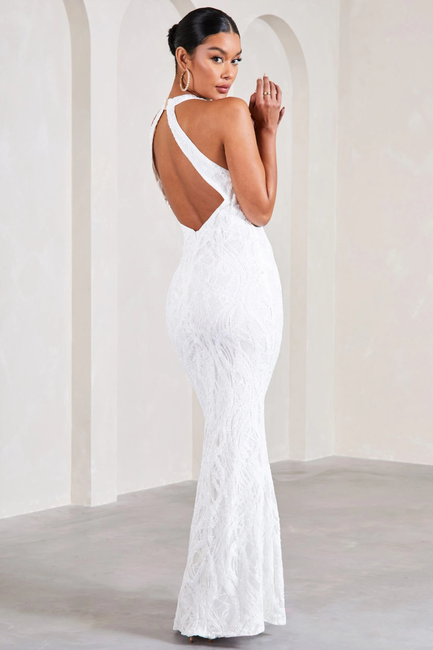 Crafted in a luxurious sequin lace, our Reserved dress was designed to stand out. Arriving in a crisp white shade, this sleeveless maxi is characterised by its daring high-leg split and open-back feature. Reserved is the perfect option for prom, especially when paired with some strappy stilettos.Â